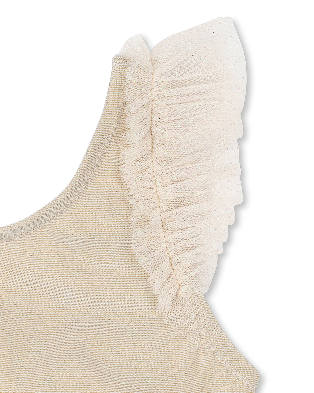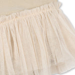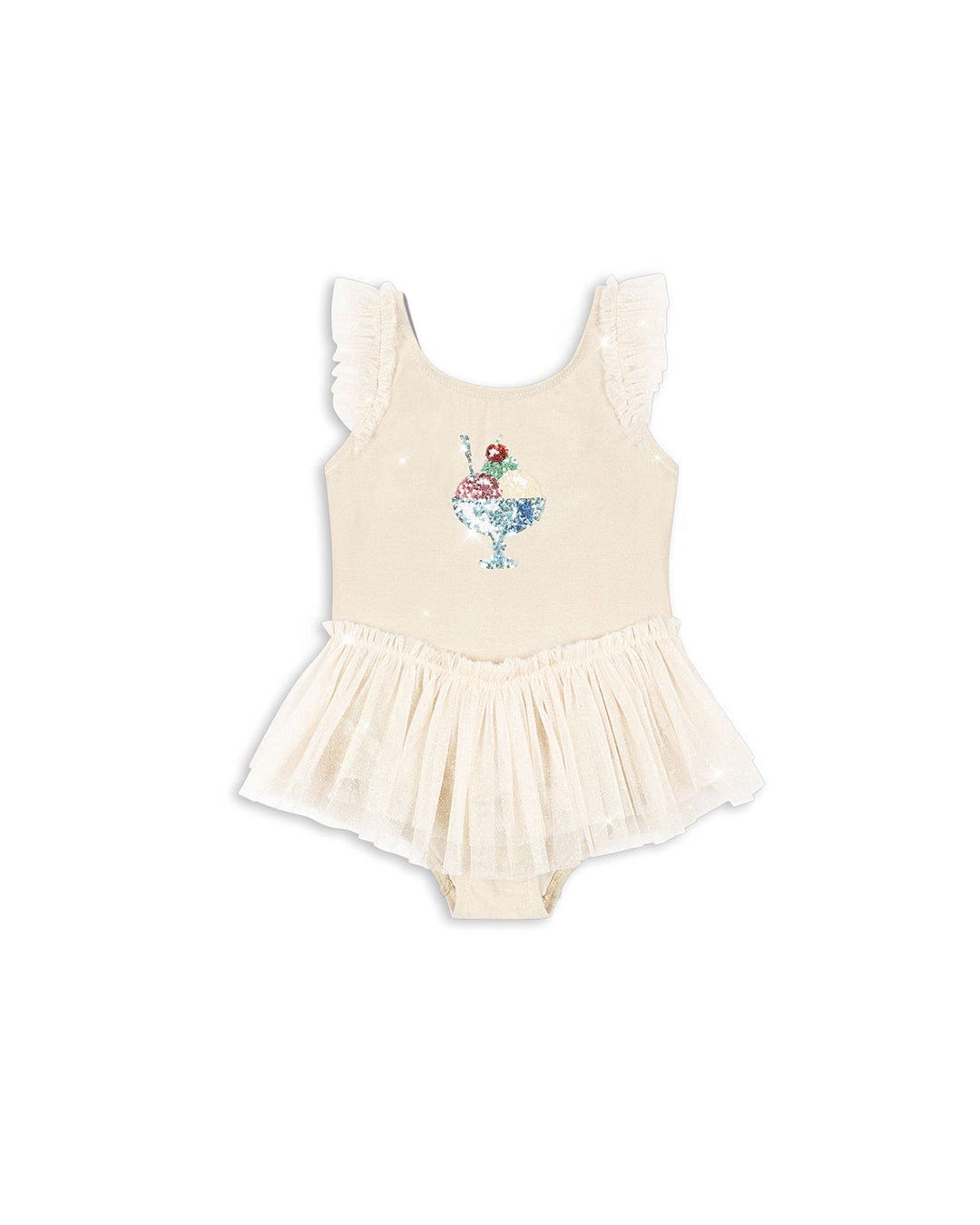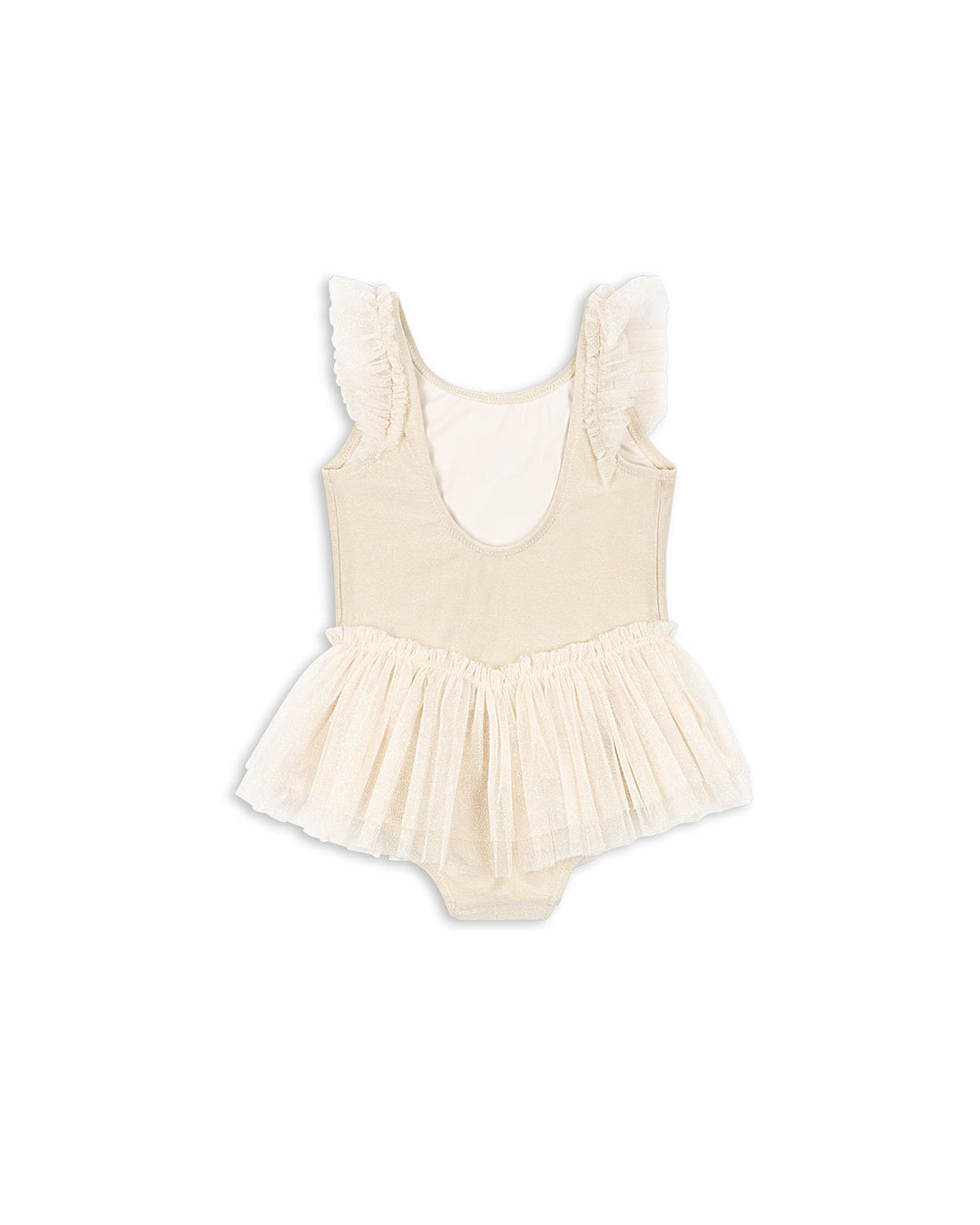 · Delicate tulle skirt and flutter shoulder details