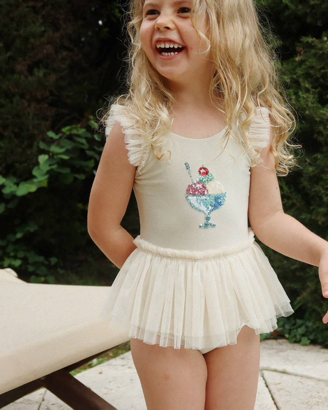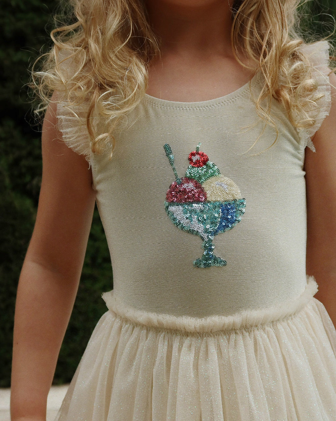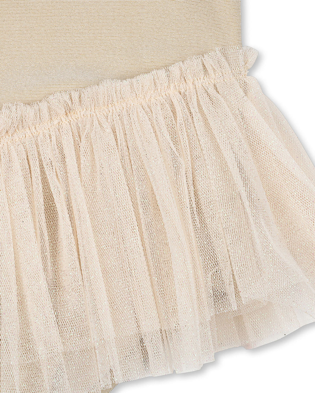 · Delicate tulle skirt and flutter shoulder details