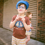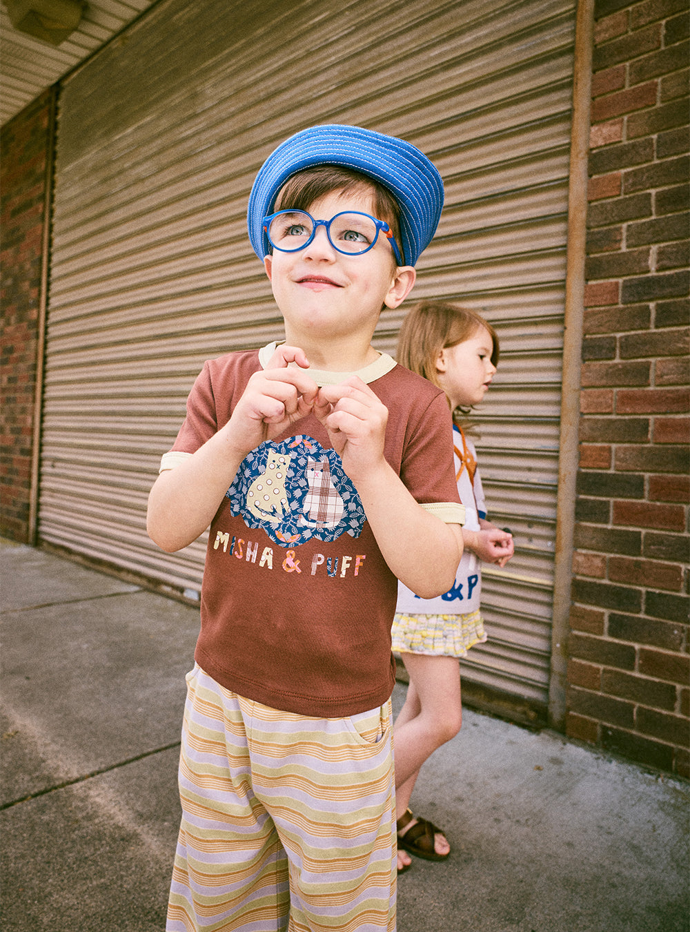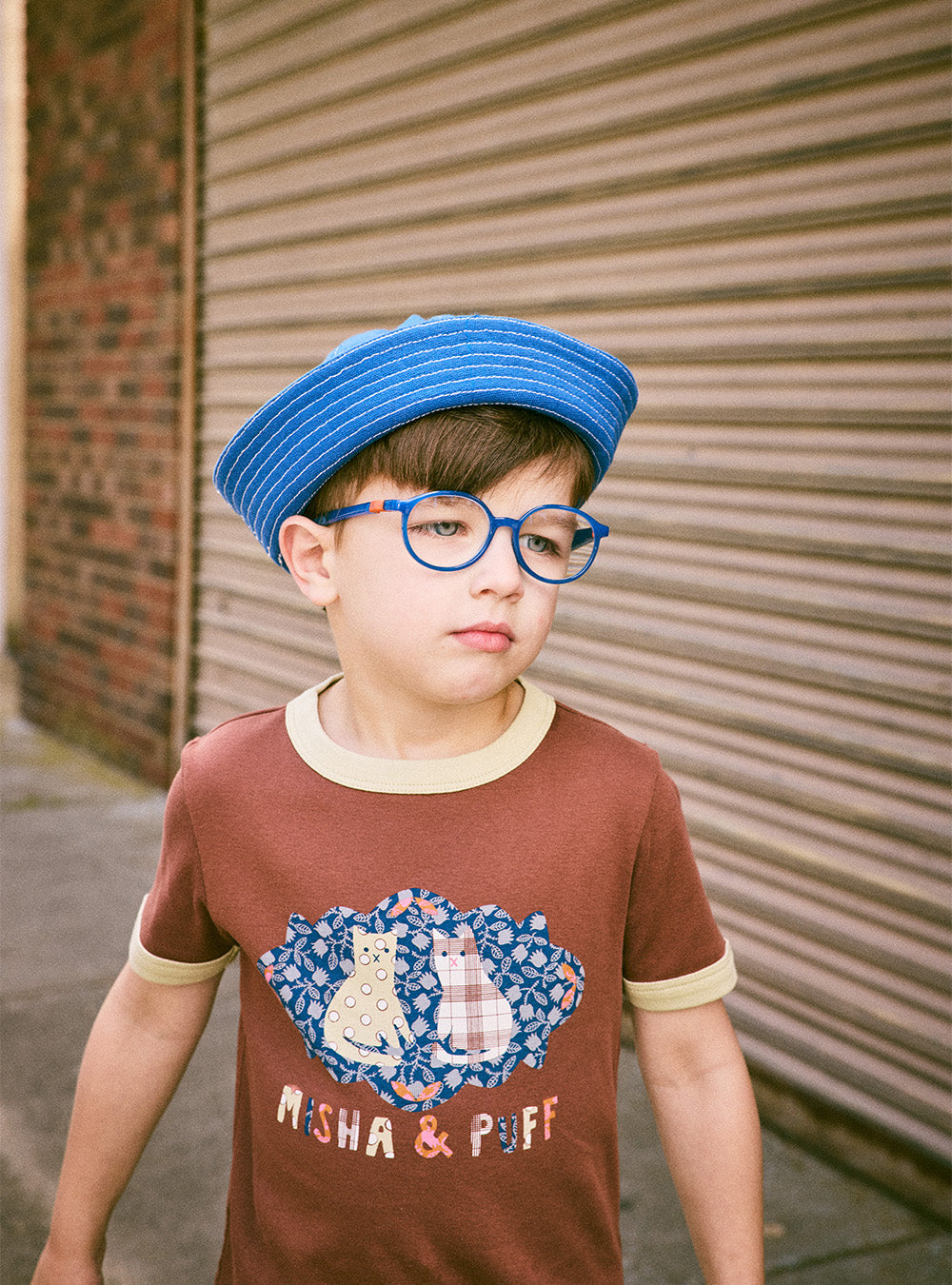 · Playful collage graphic featuring signature Misha & Puff artwork