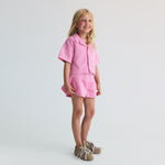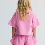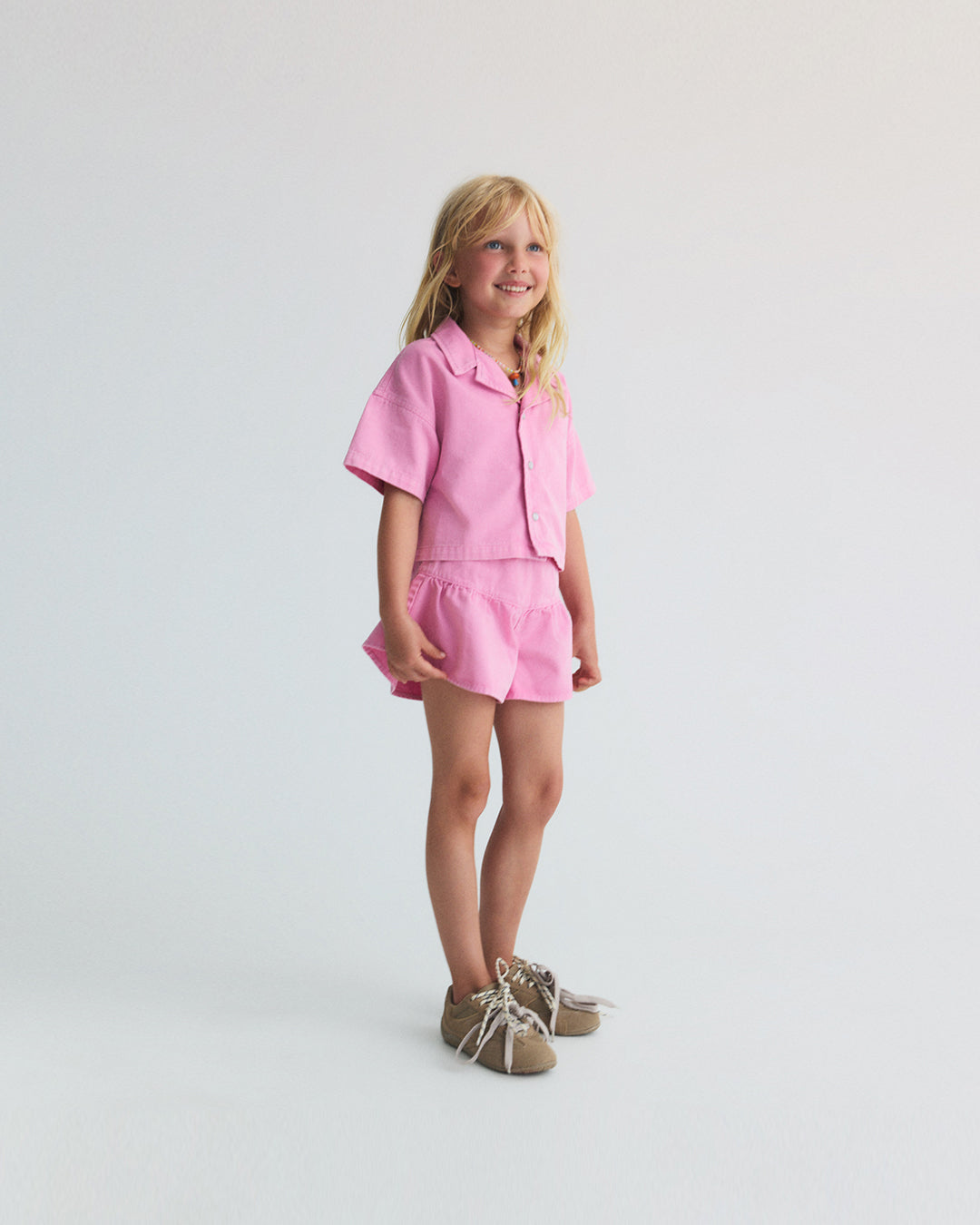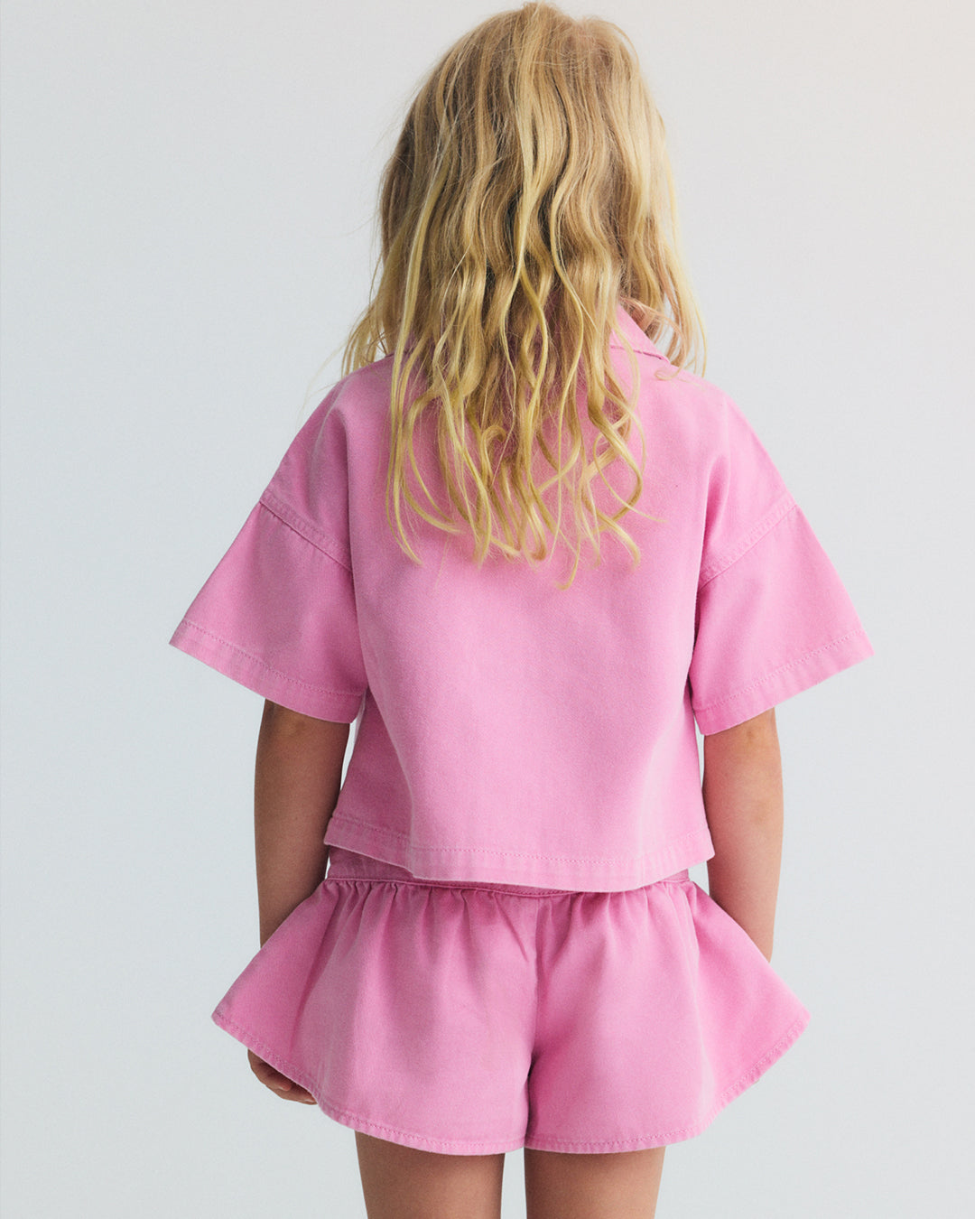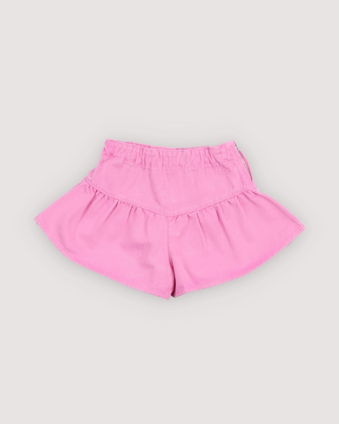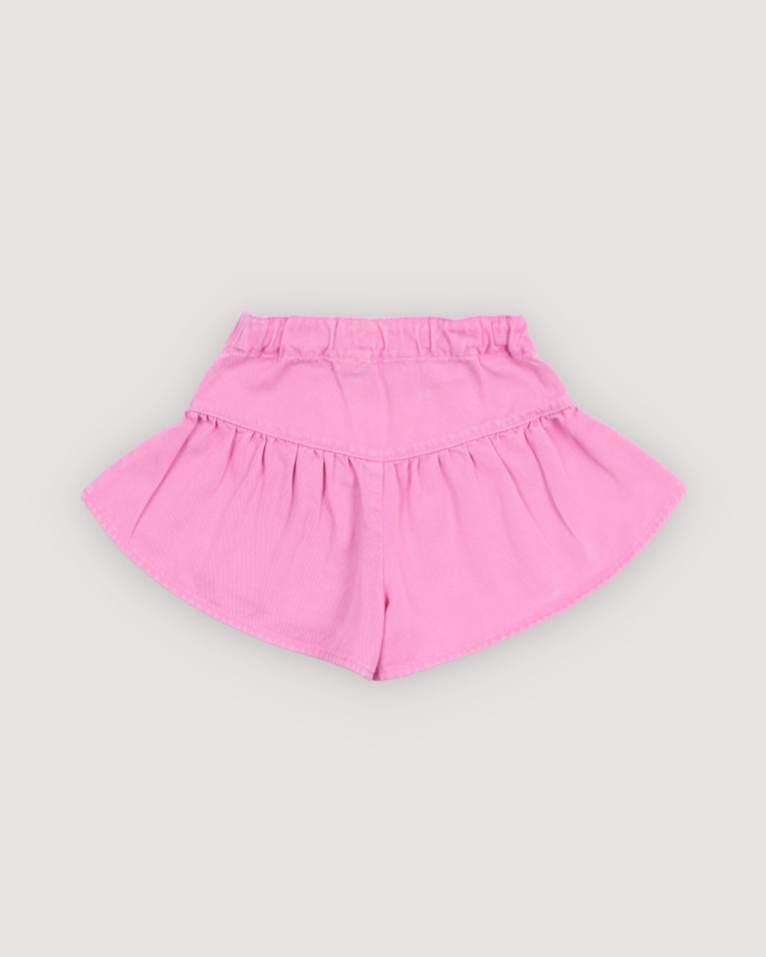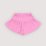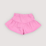 · Soft blush-rose shorts with a sweet flared overskirt effect