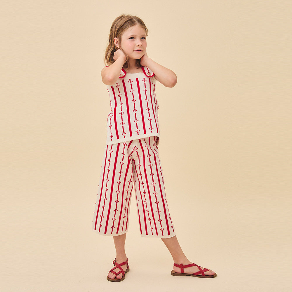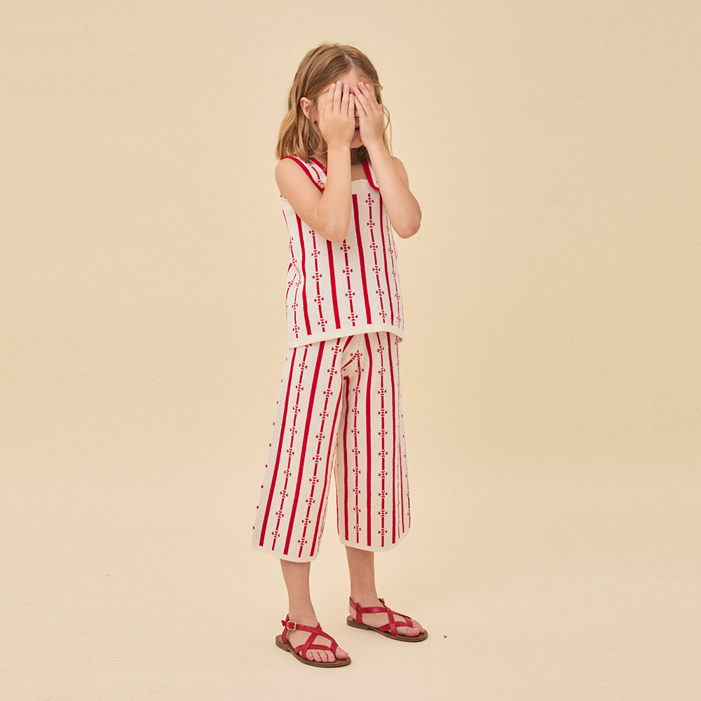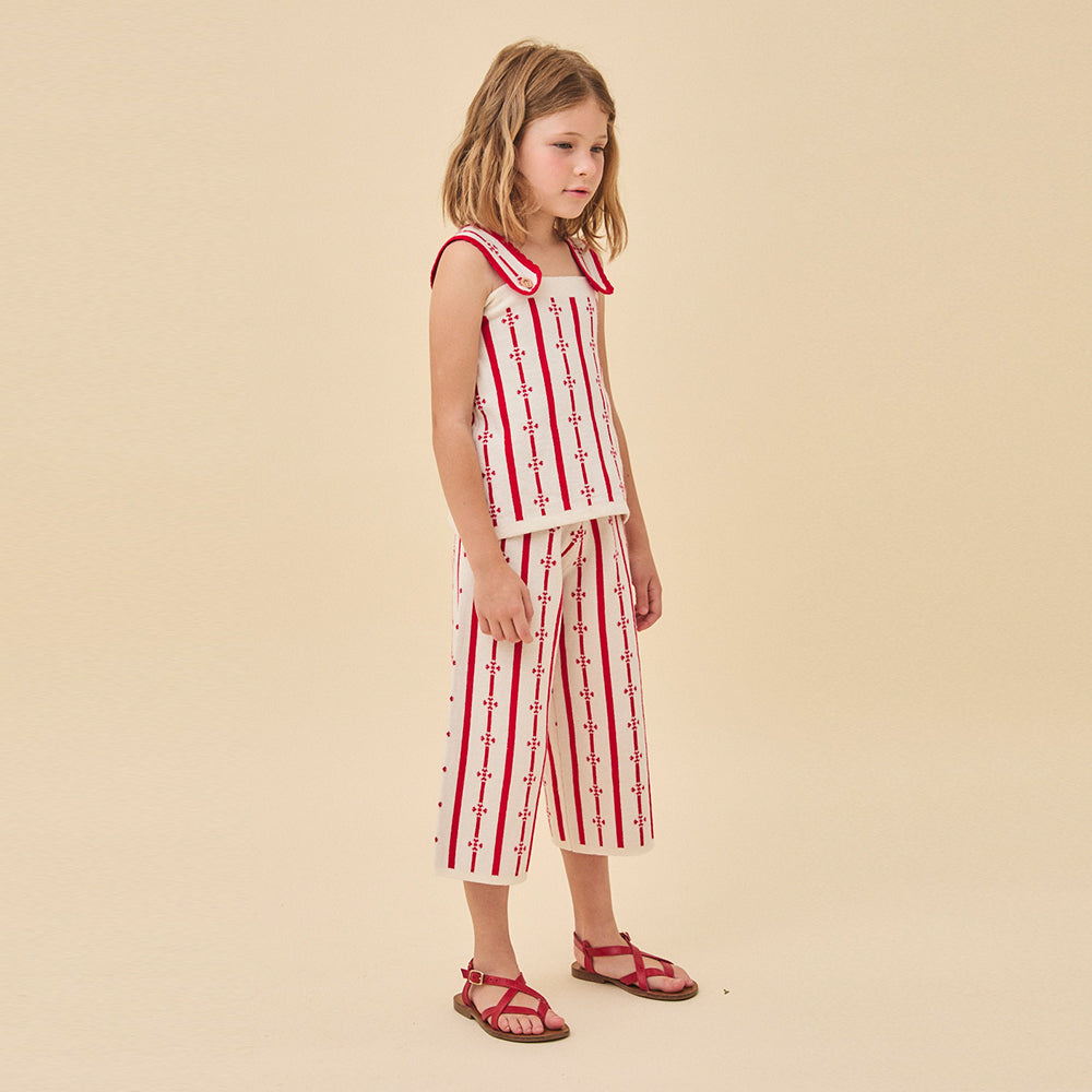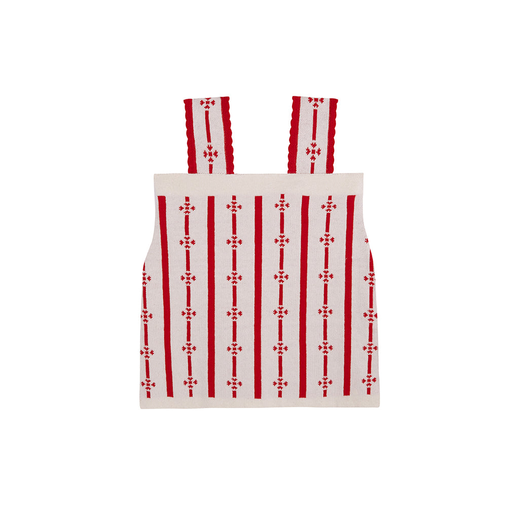 · Shoulder straps adorned with scalloped edges and secured with wooden buttons
