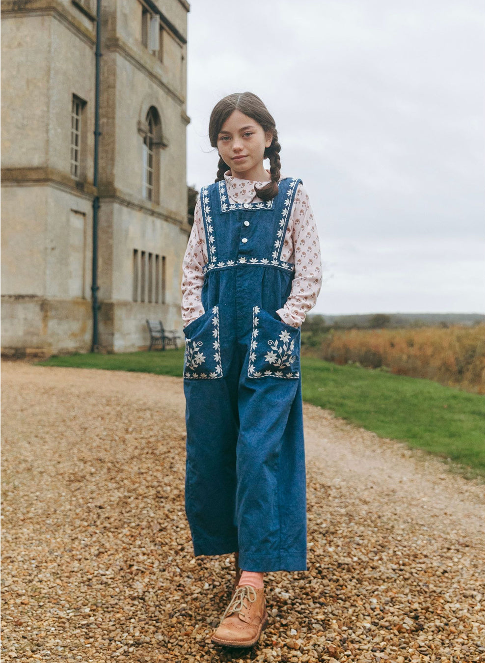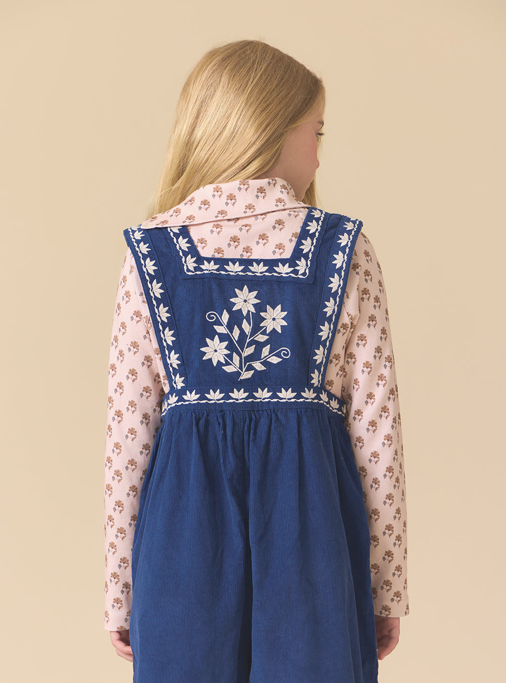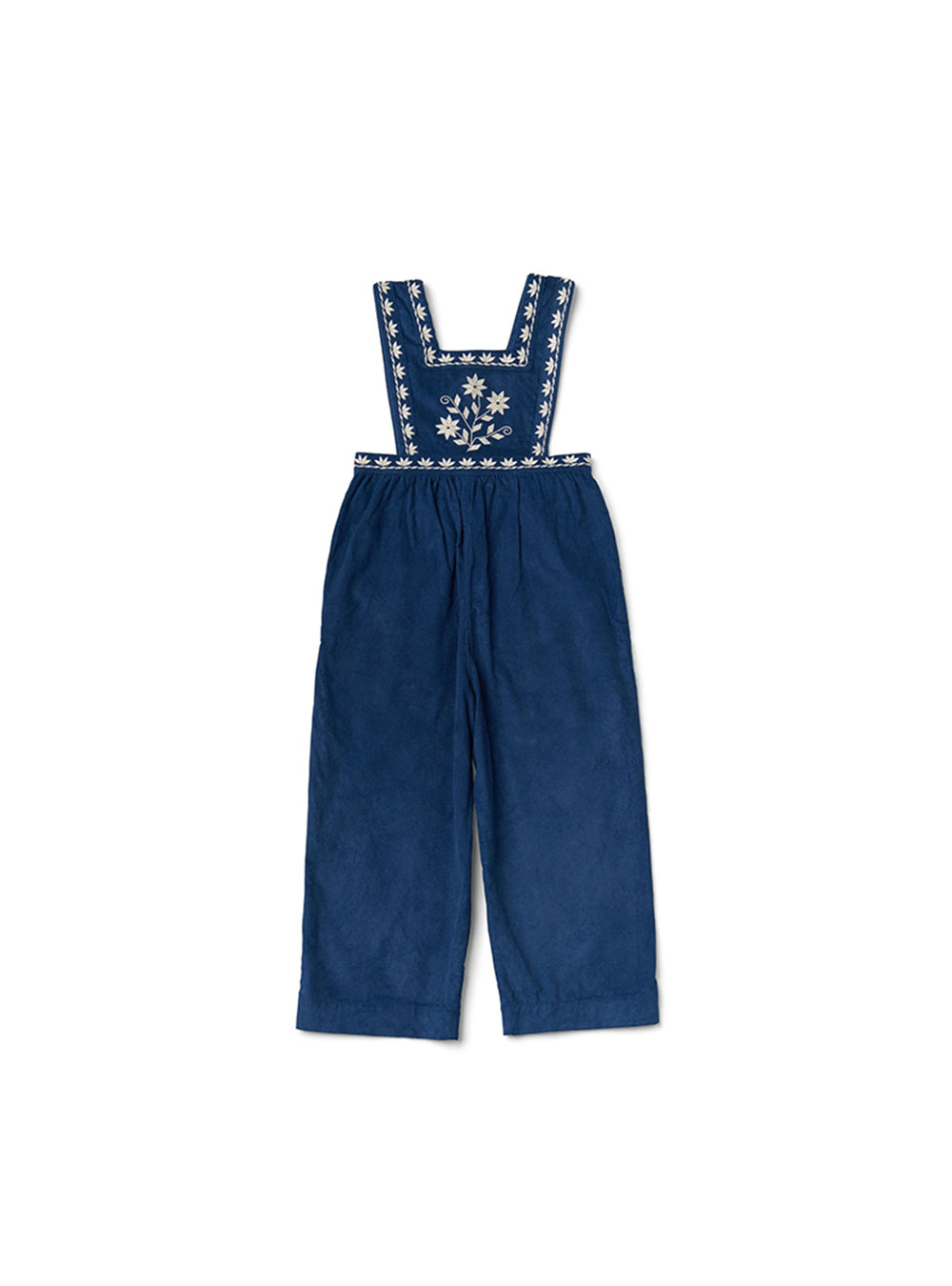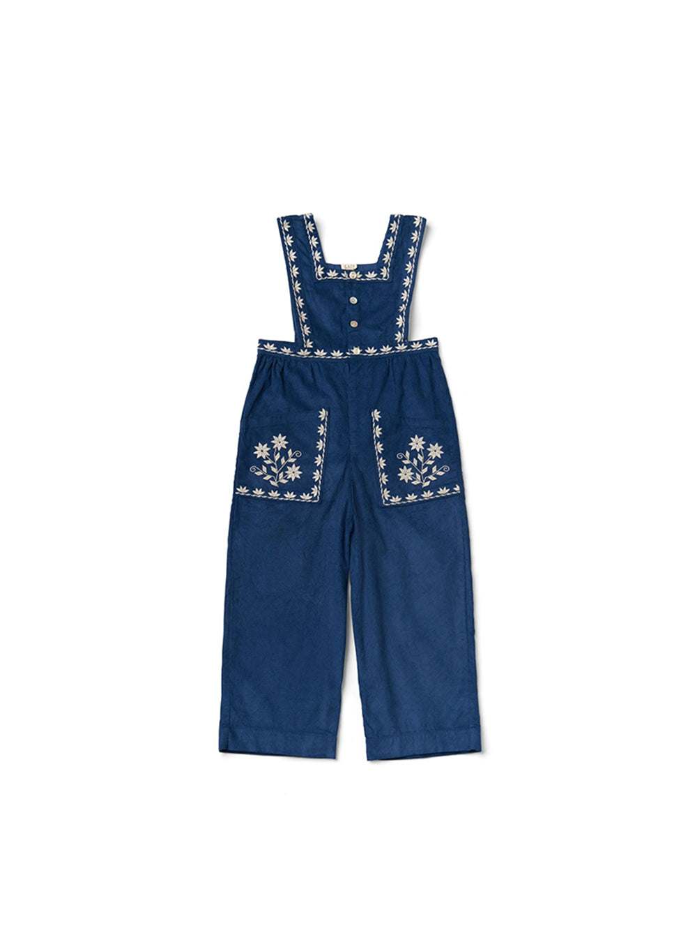 · Features intricate ivory floral embroidery on bib and patch pockets
