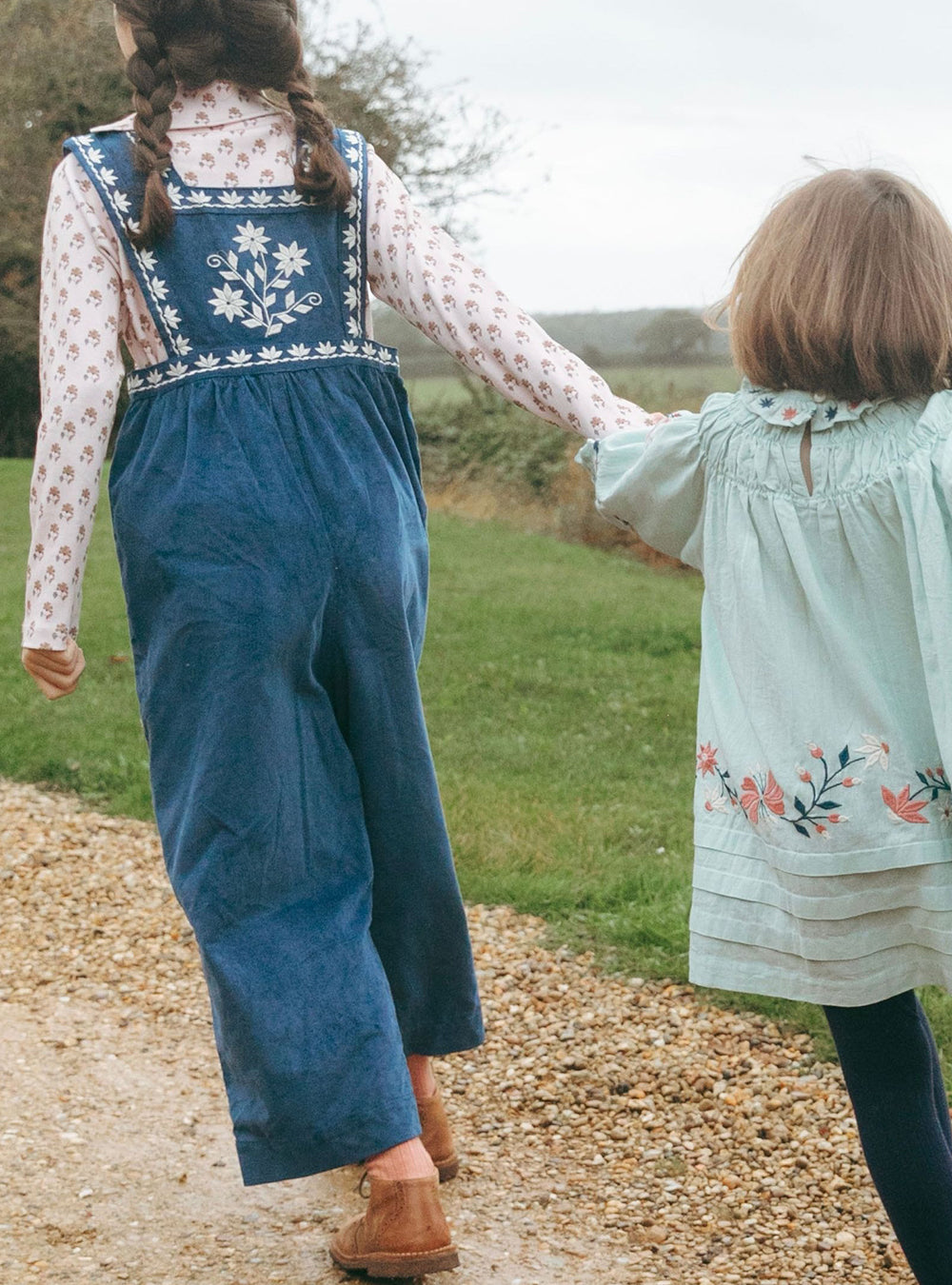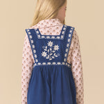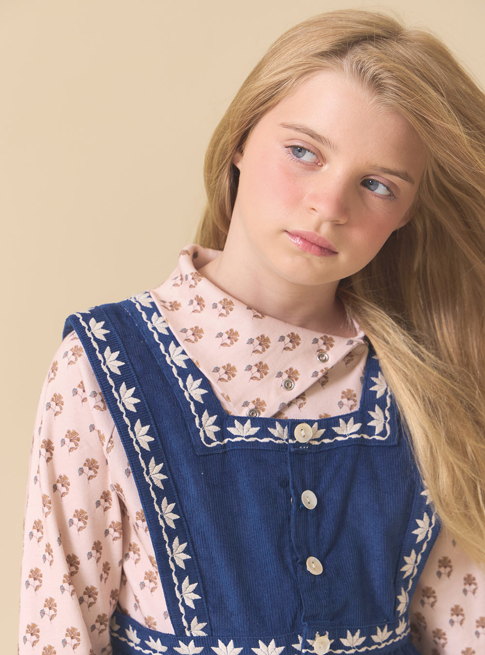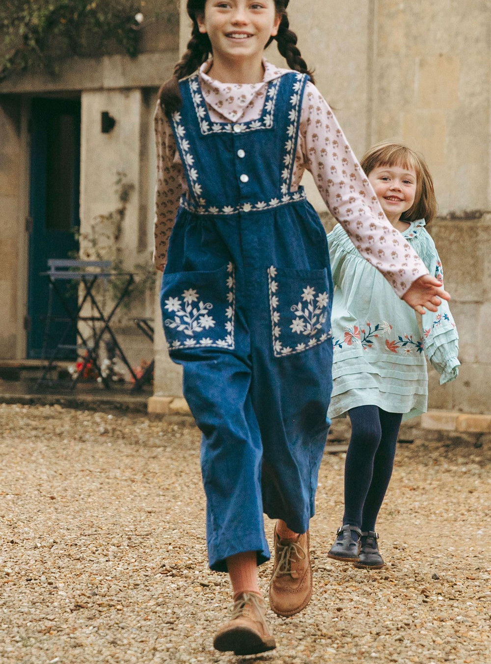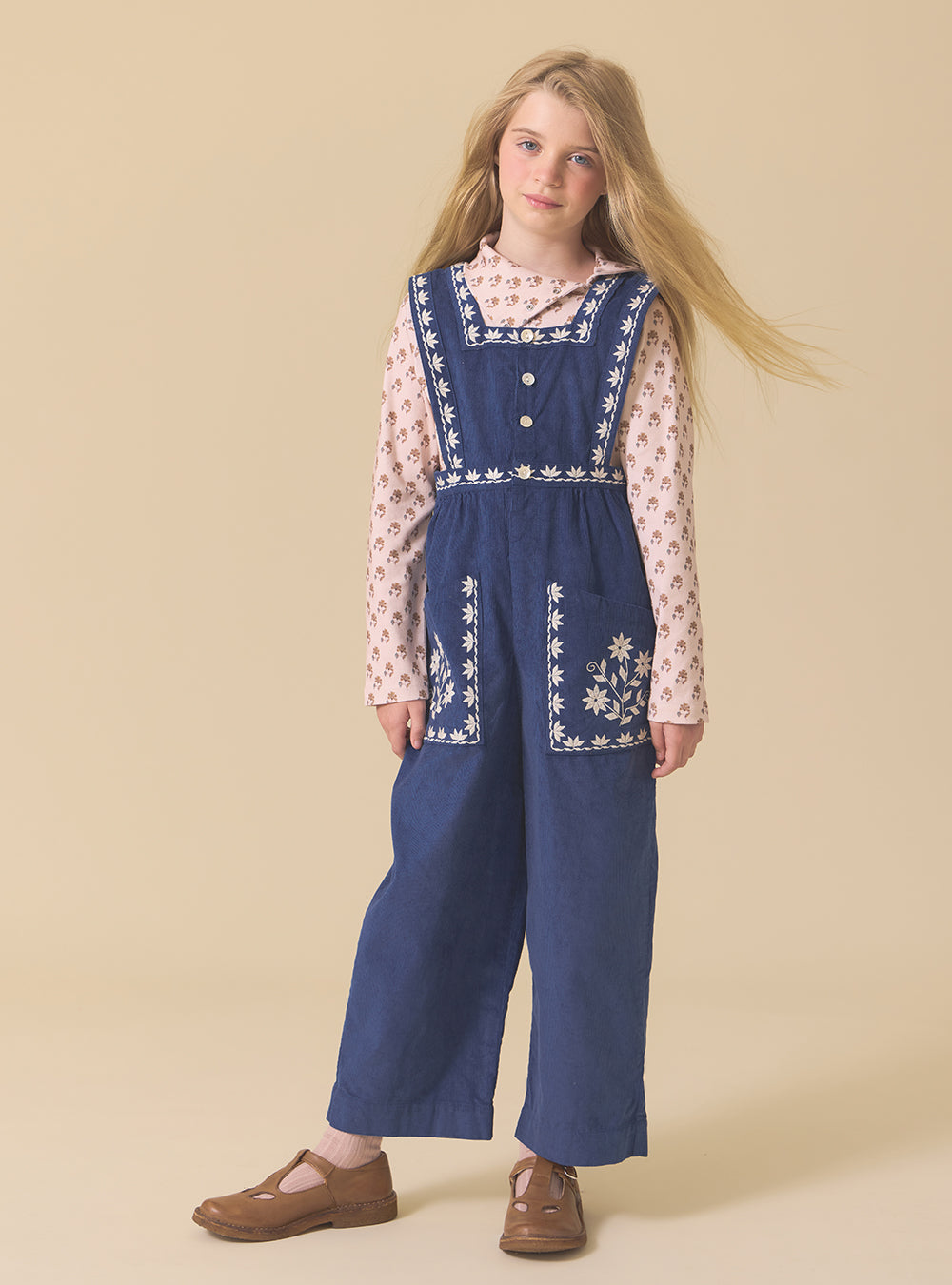 · Features intricate ivory floral embroidery on bib and patch pockets