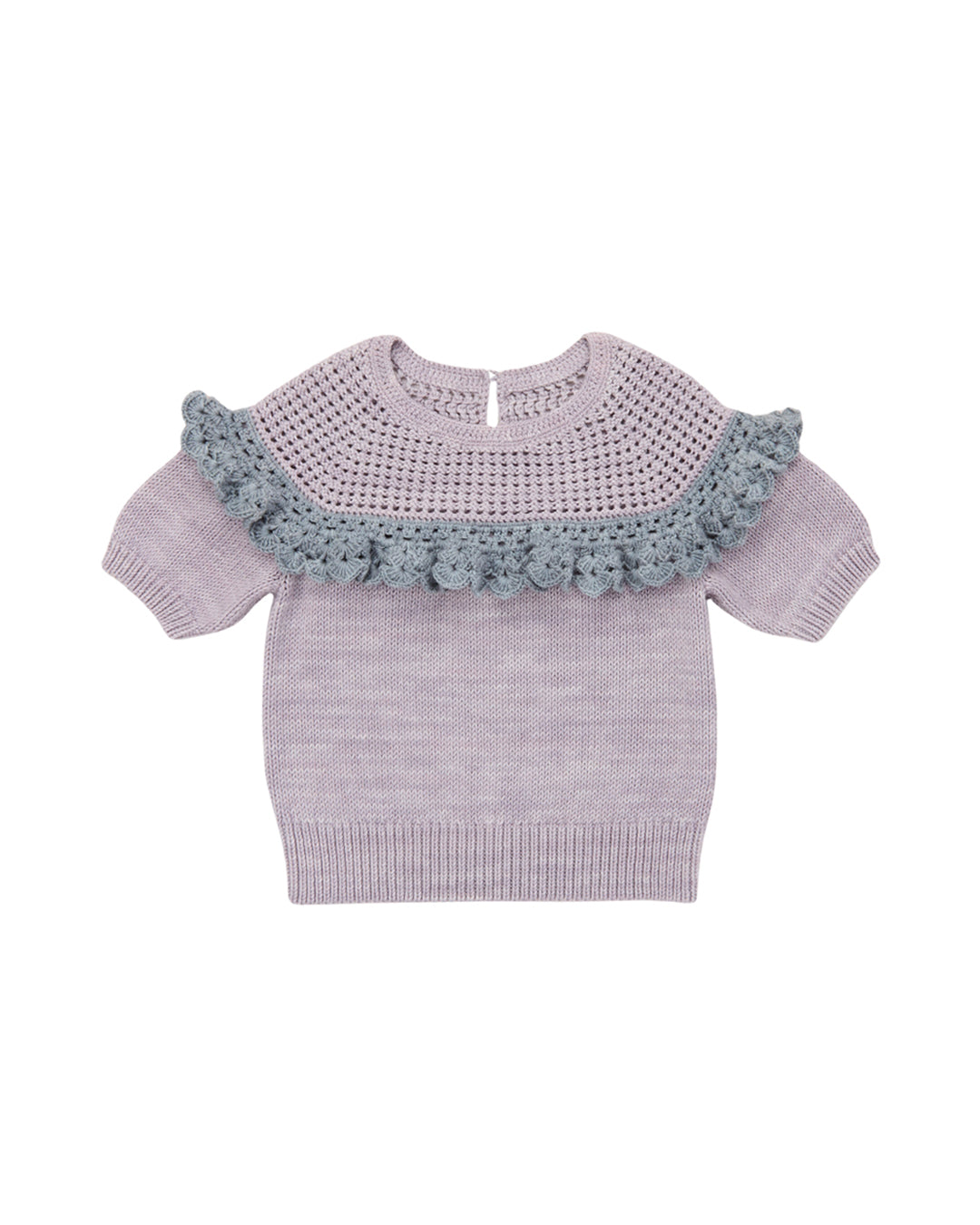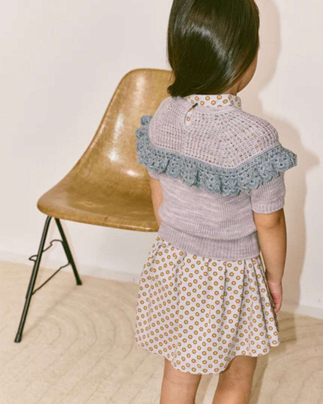 · Hand-crochet scalloped yoke in subtle blue-grey