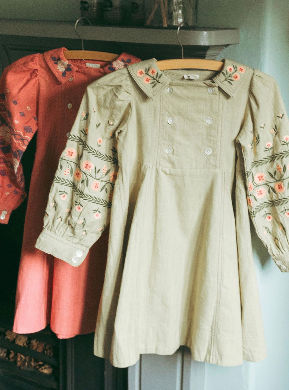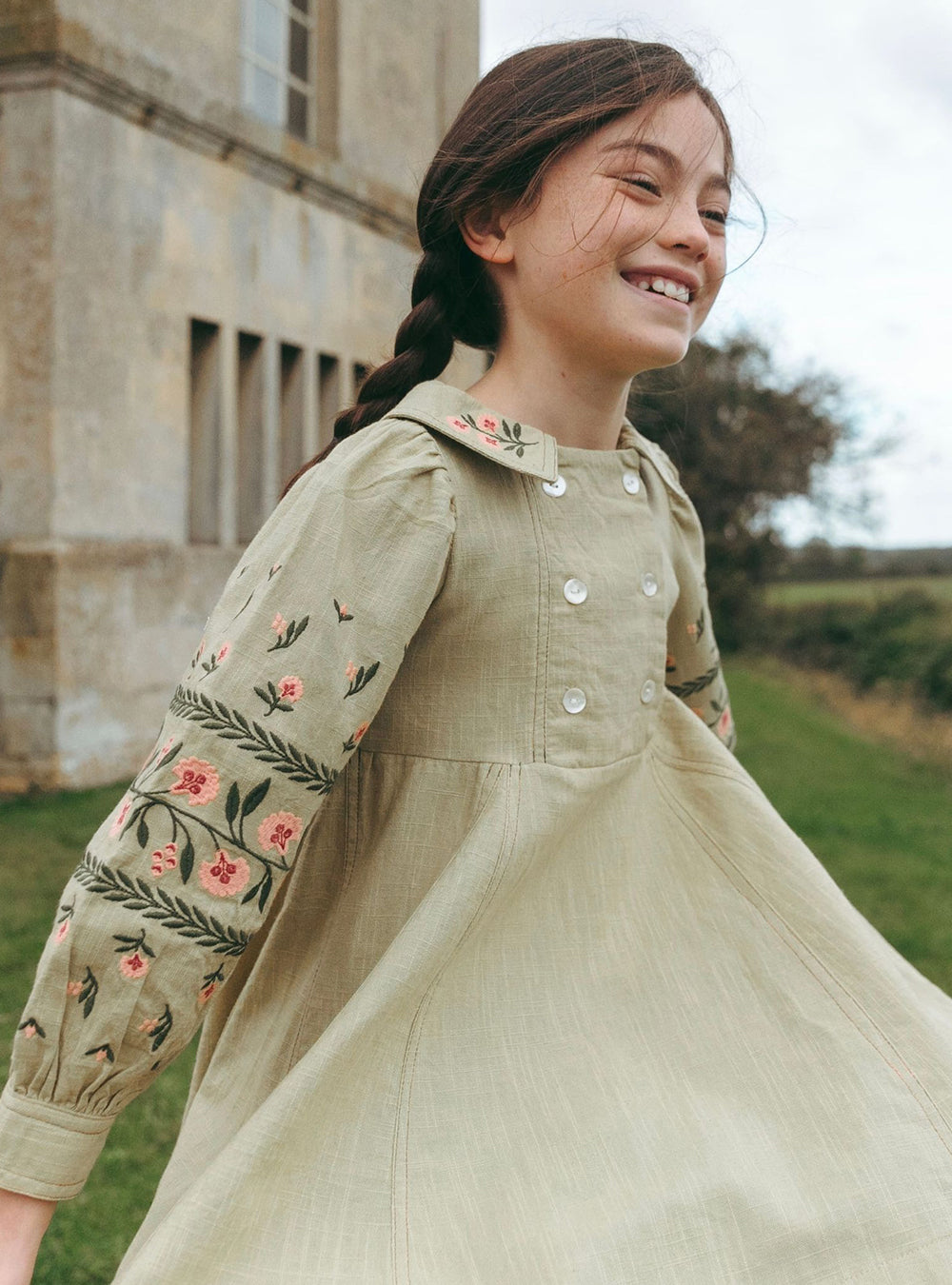 · Intricate floral embroidery in soft pink and green