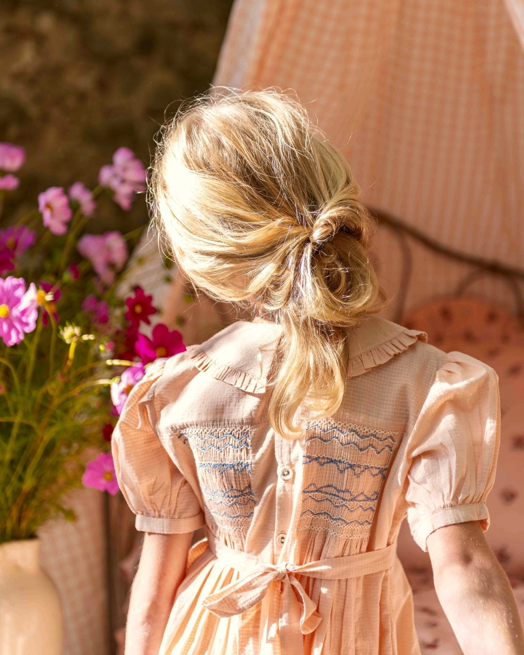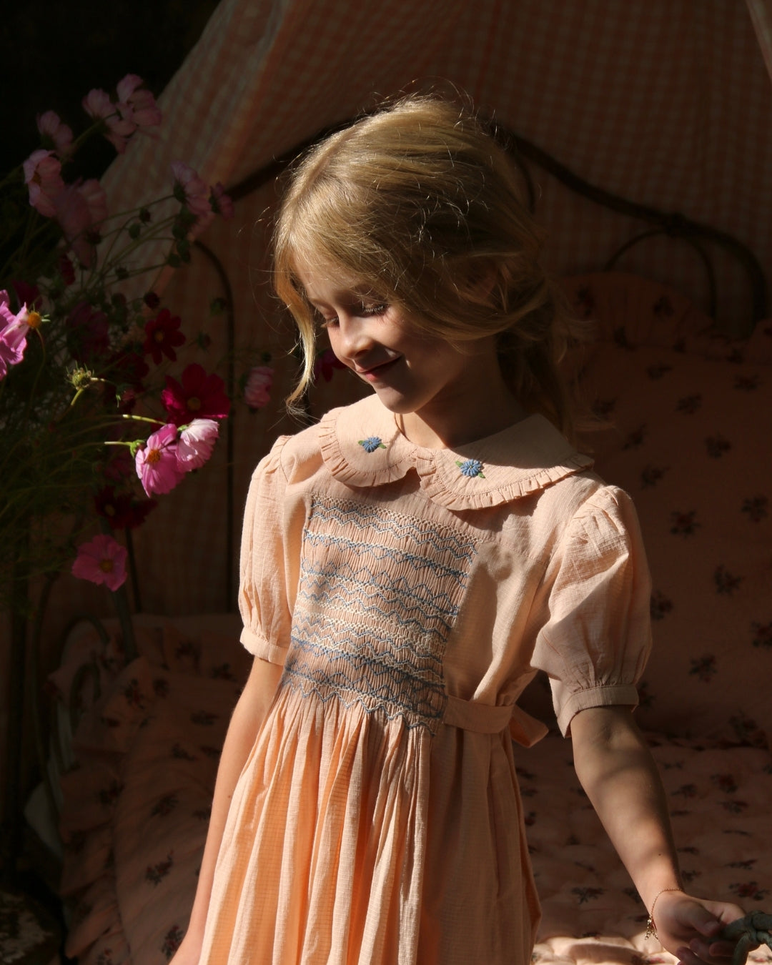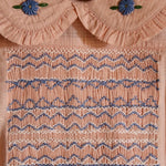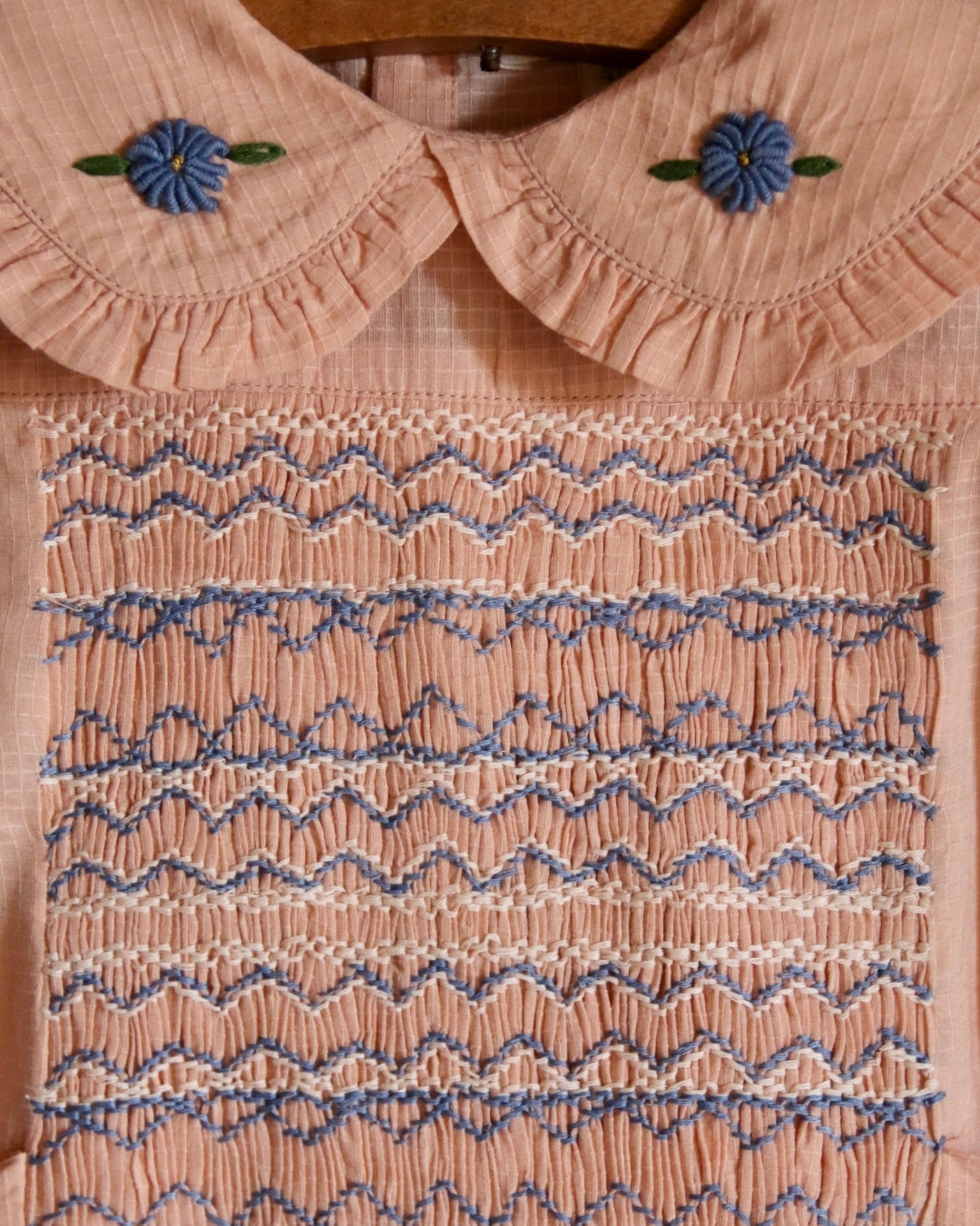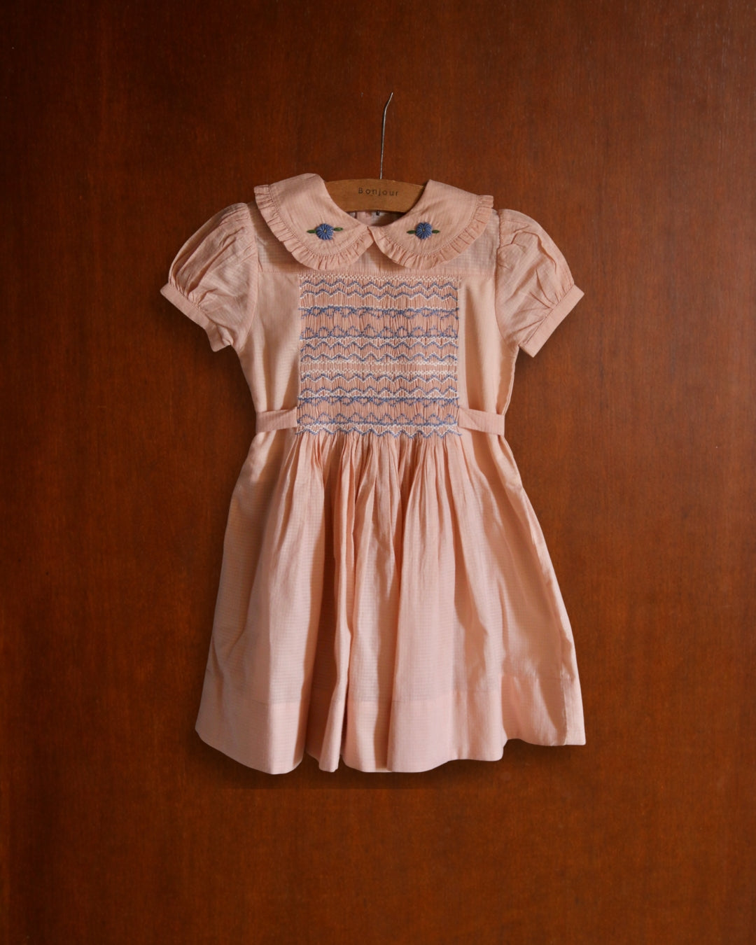 · A soft pink dress featuring delicate hand-smocking with blue embroidery across the bodice
