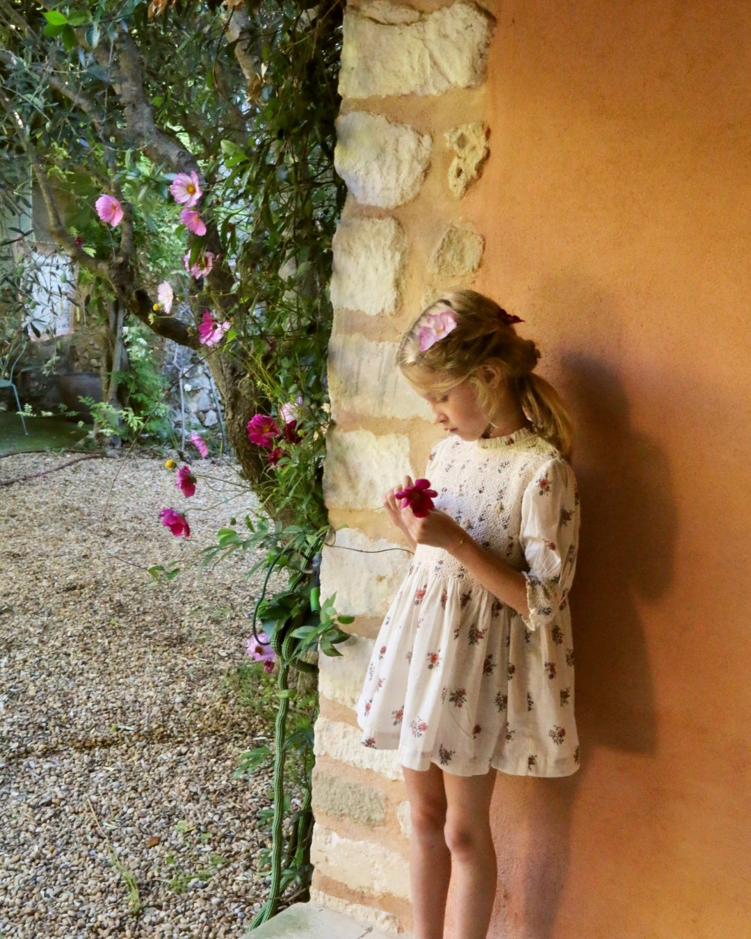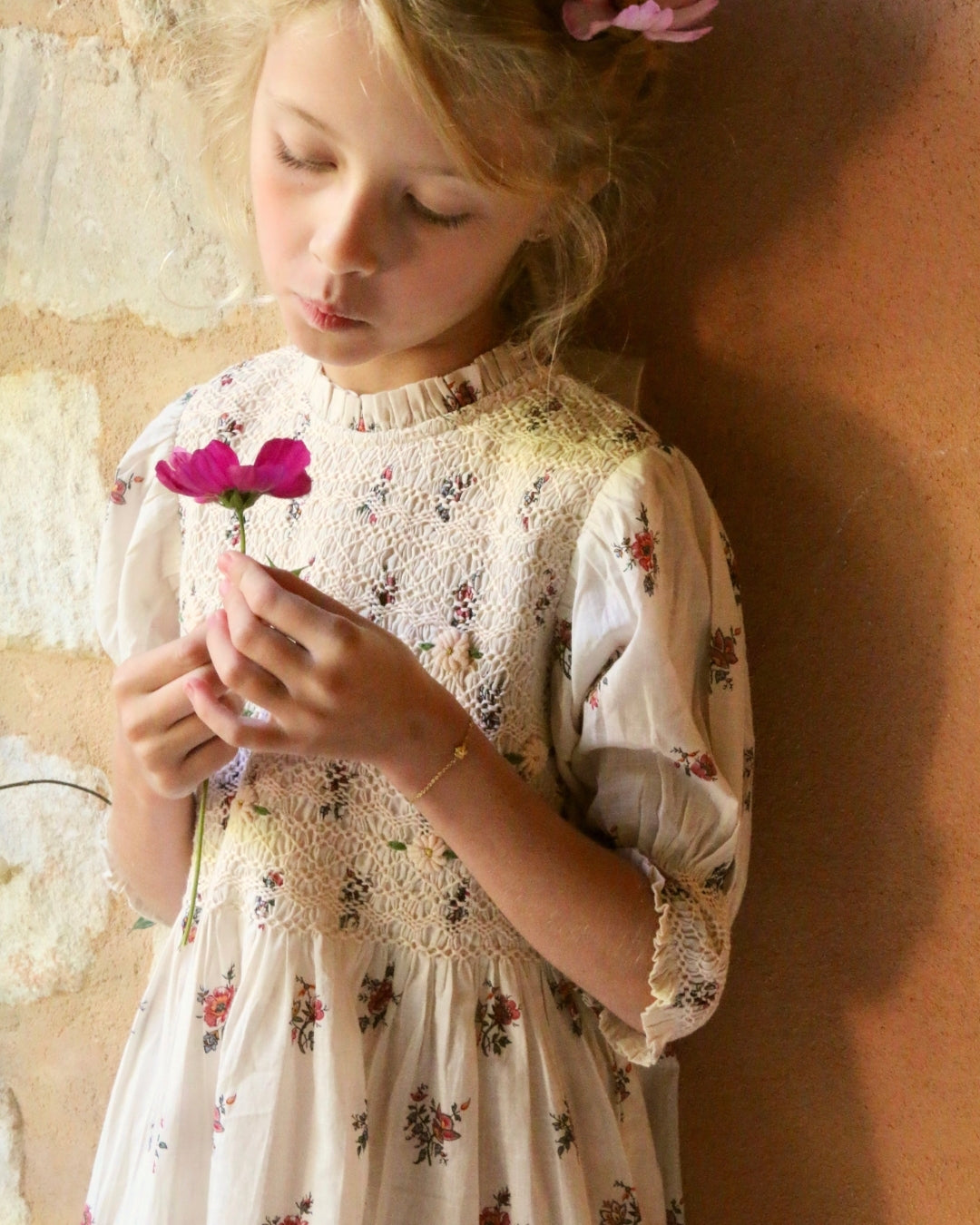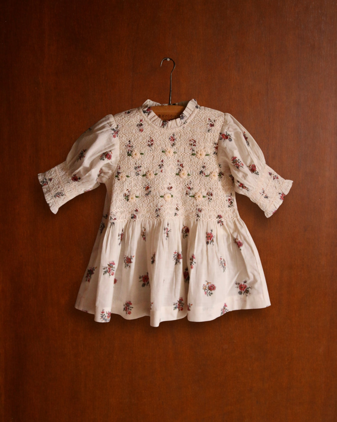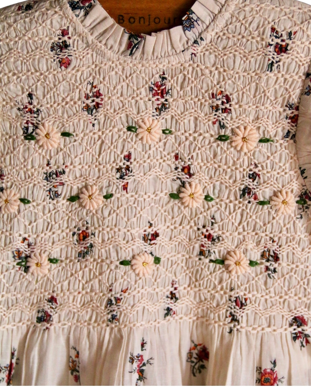 · A romantic floral dress with all-over hand-smocking