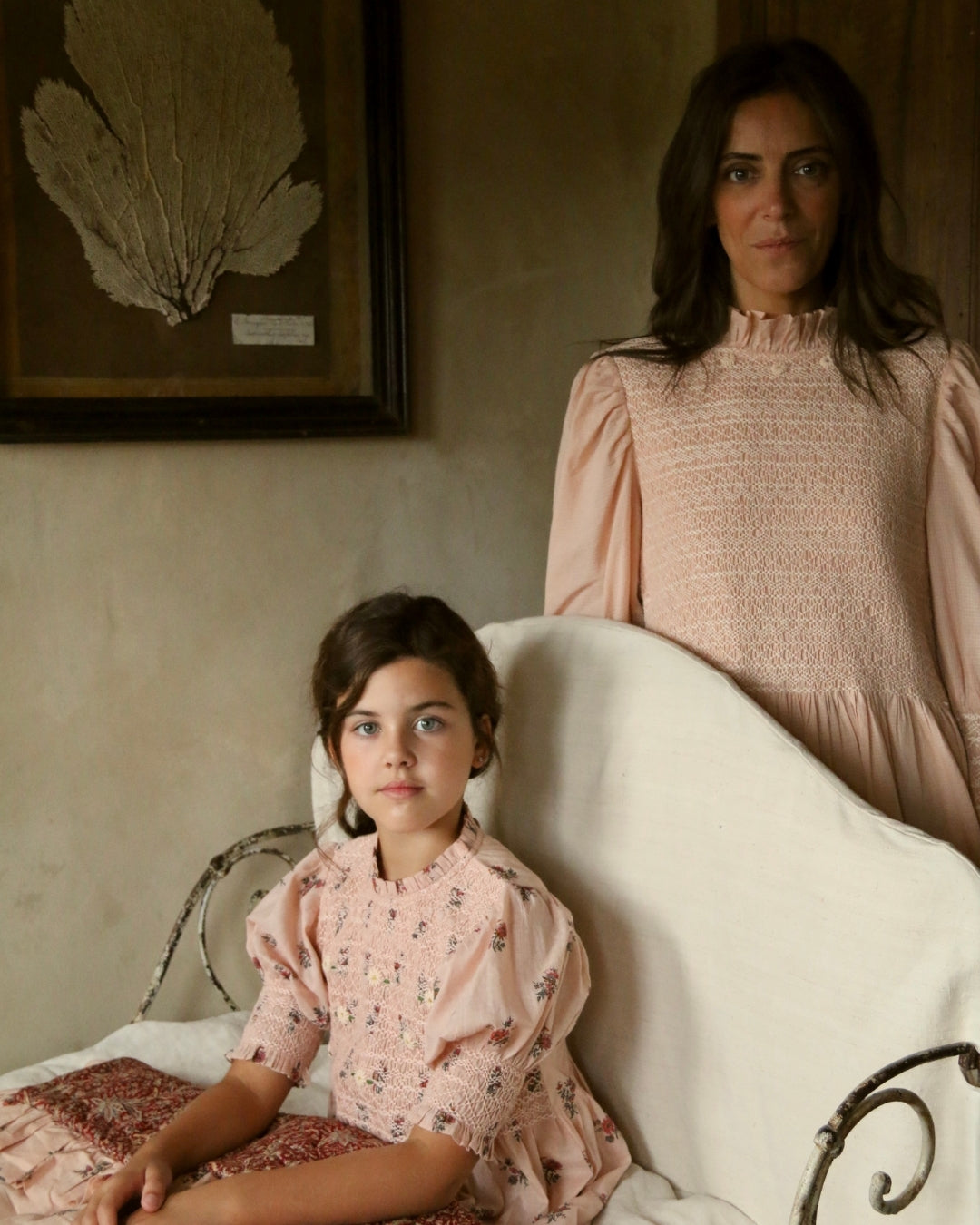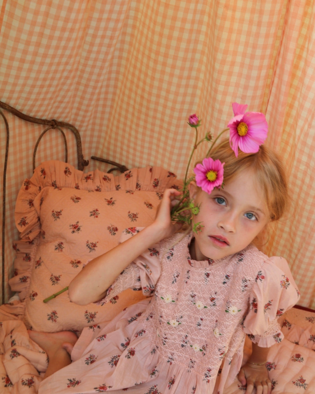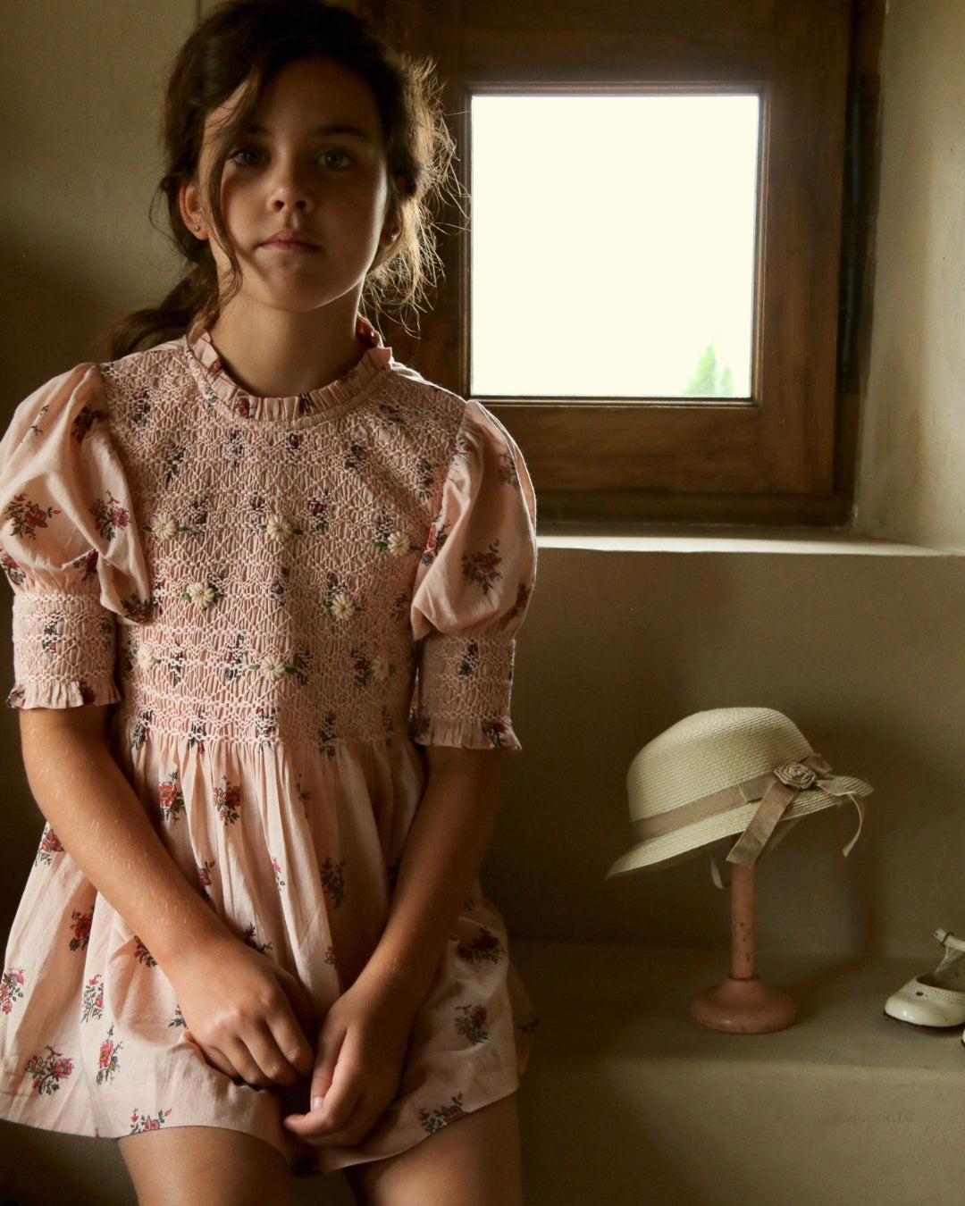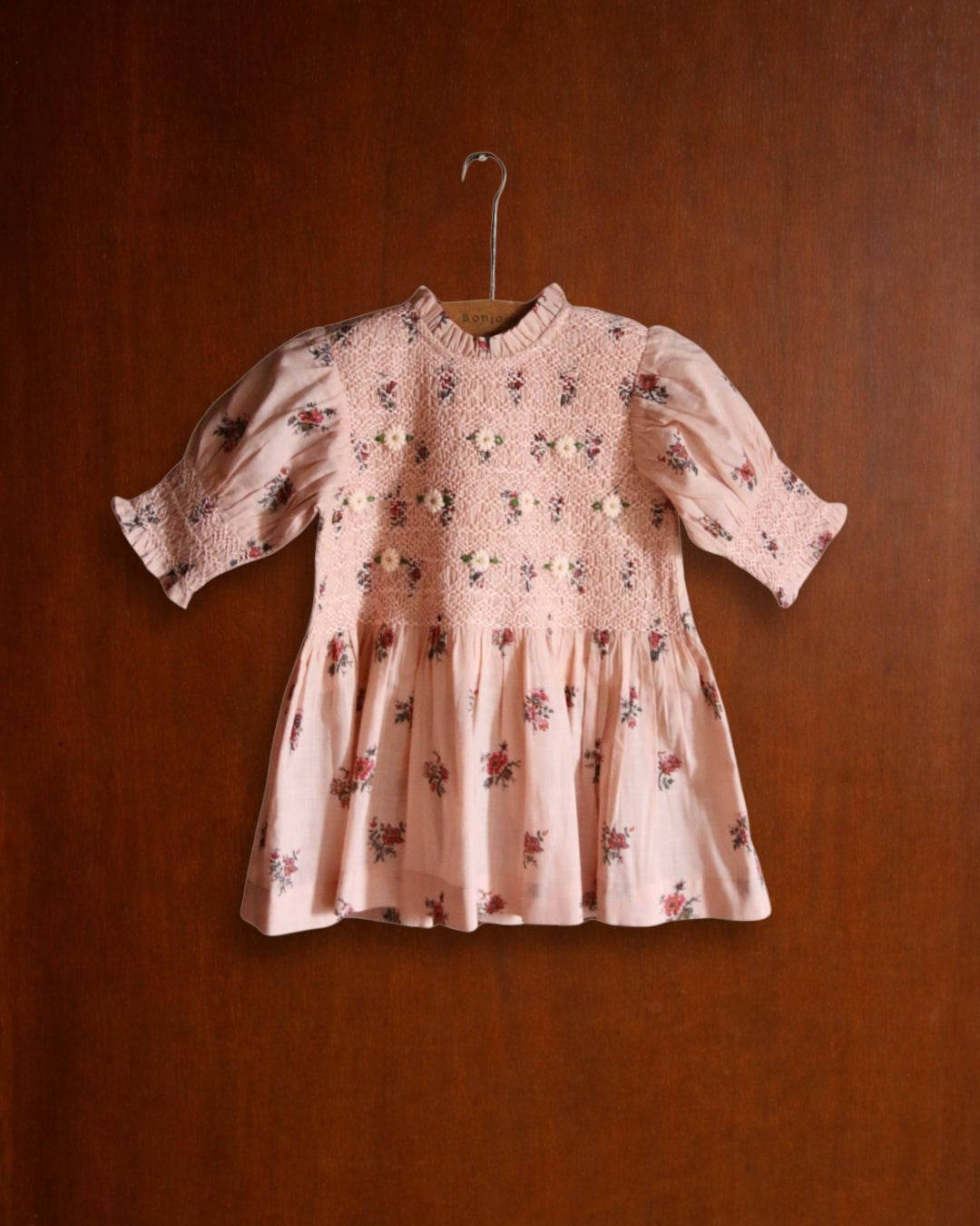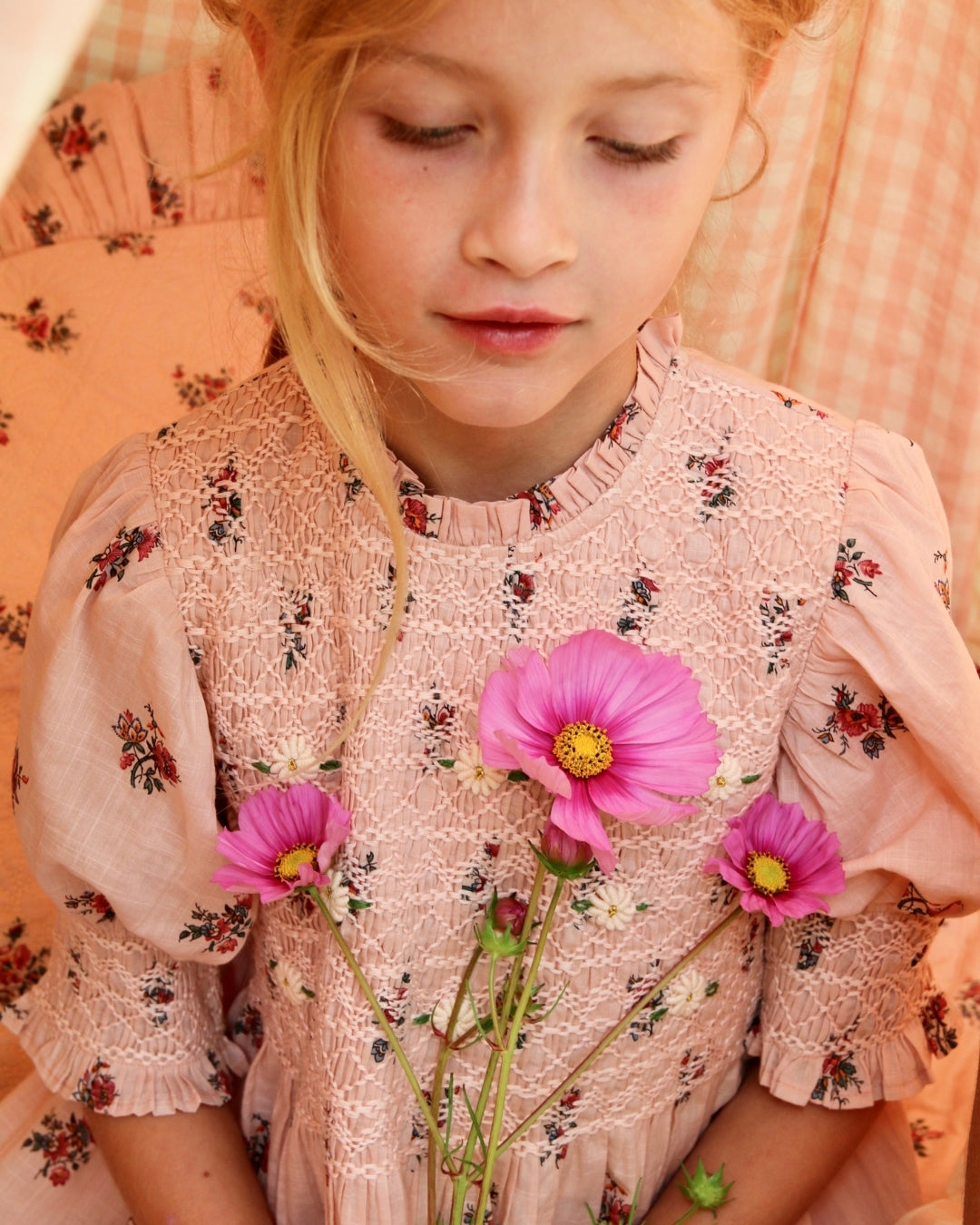 · A soft pink blouse adorned with delicate garden floral prints and intricate hand-smocking across the bodice