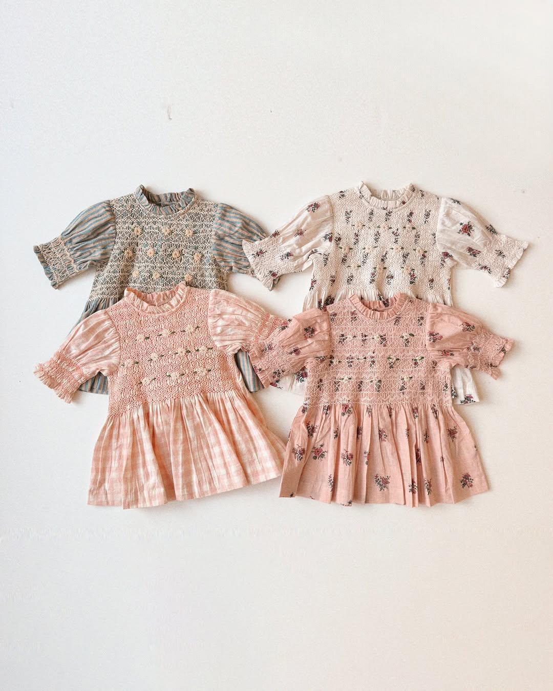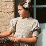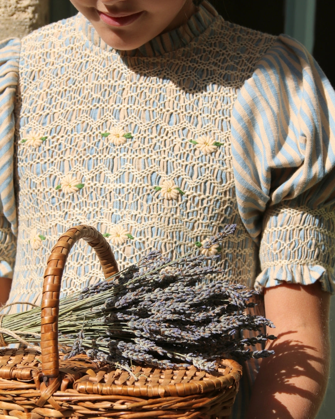 · A delicate smocked blouse with intricate hand embroidery across the bodice