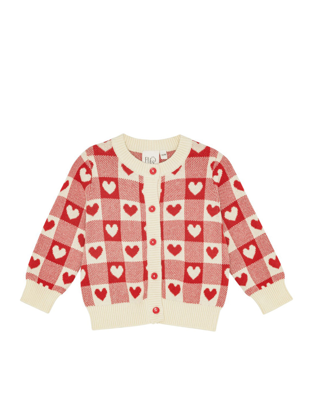 · Cream and poppy red checkered knit with heart pattern