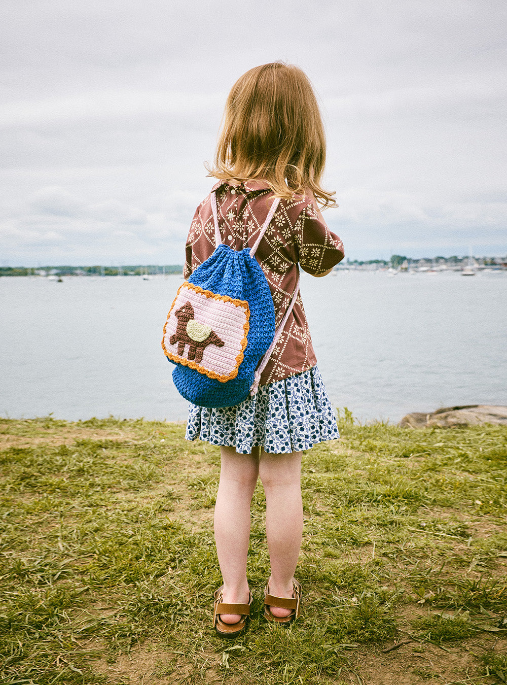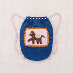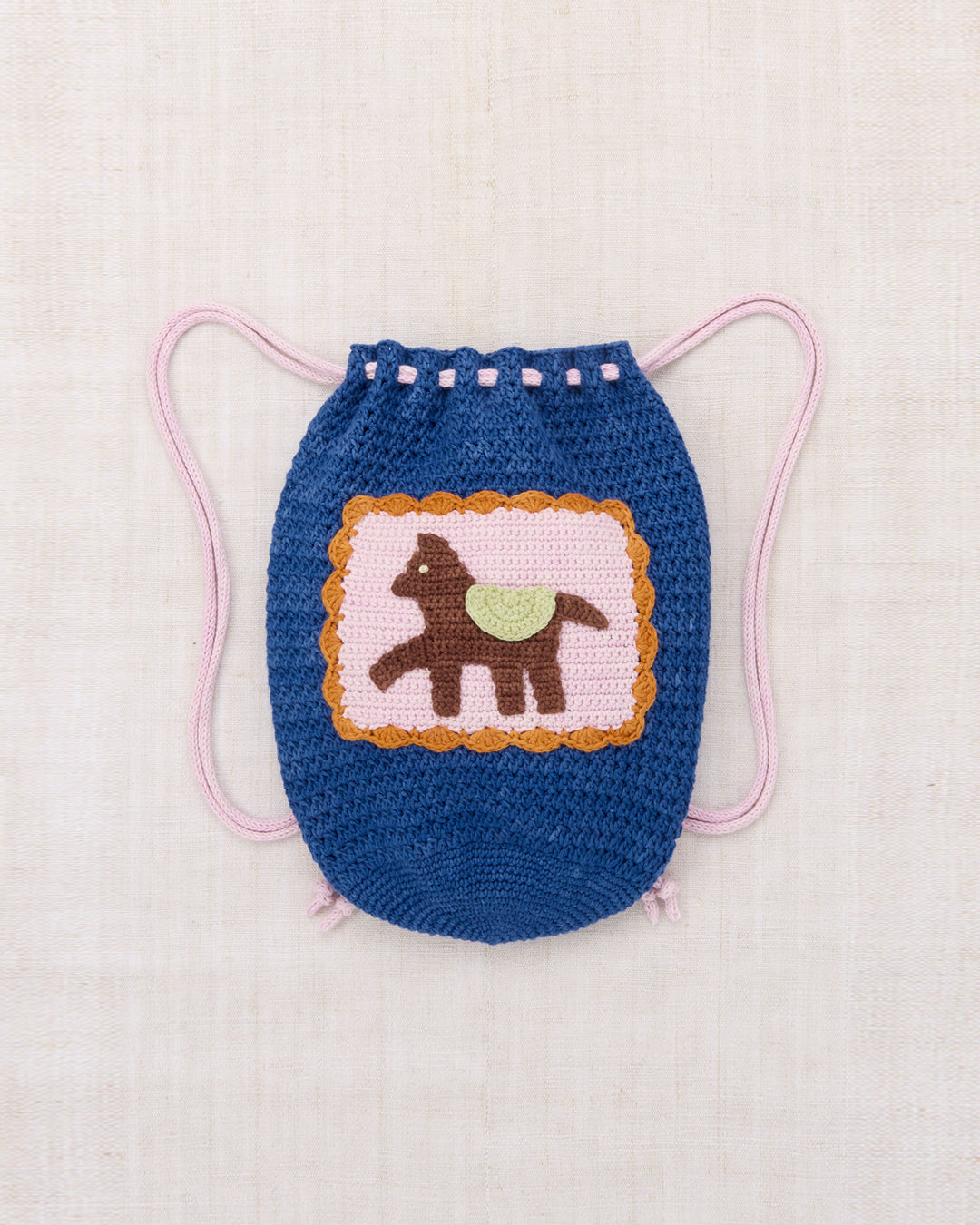· Hand-crocheted drawstring bag in a deep blue tone with soft pink straps