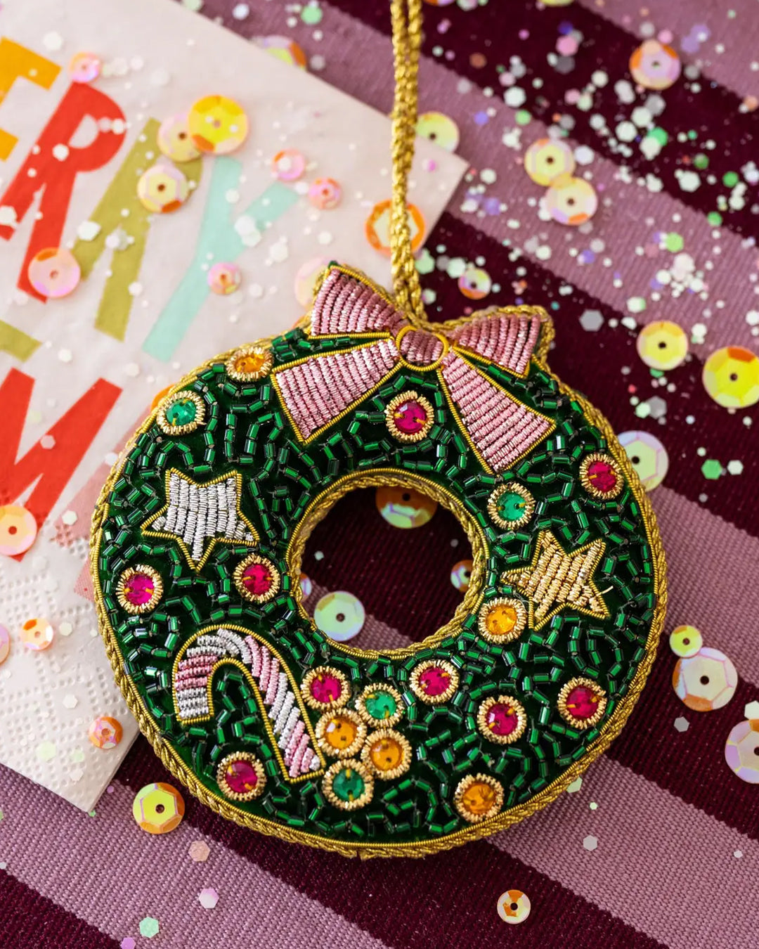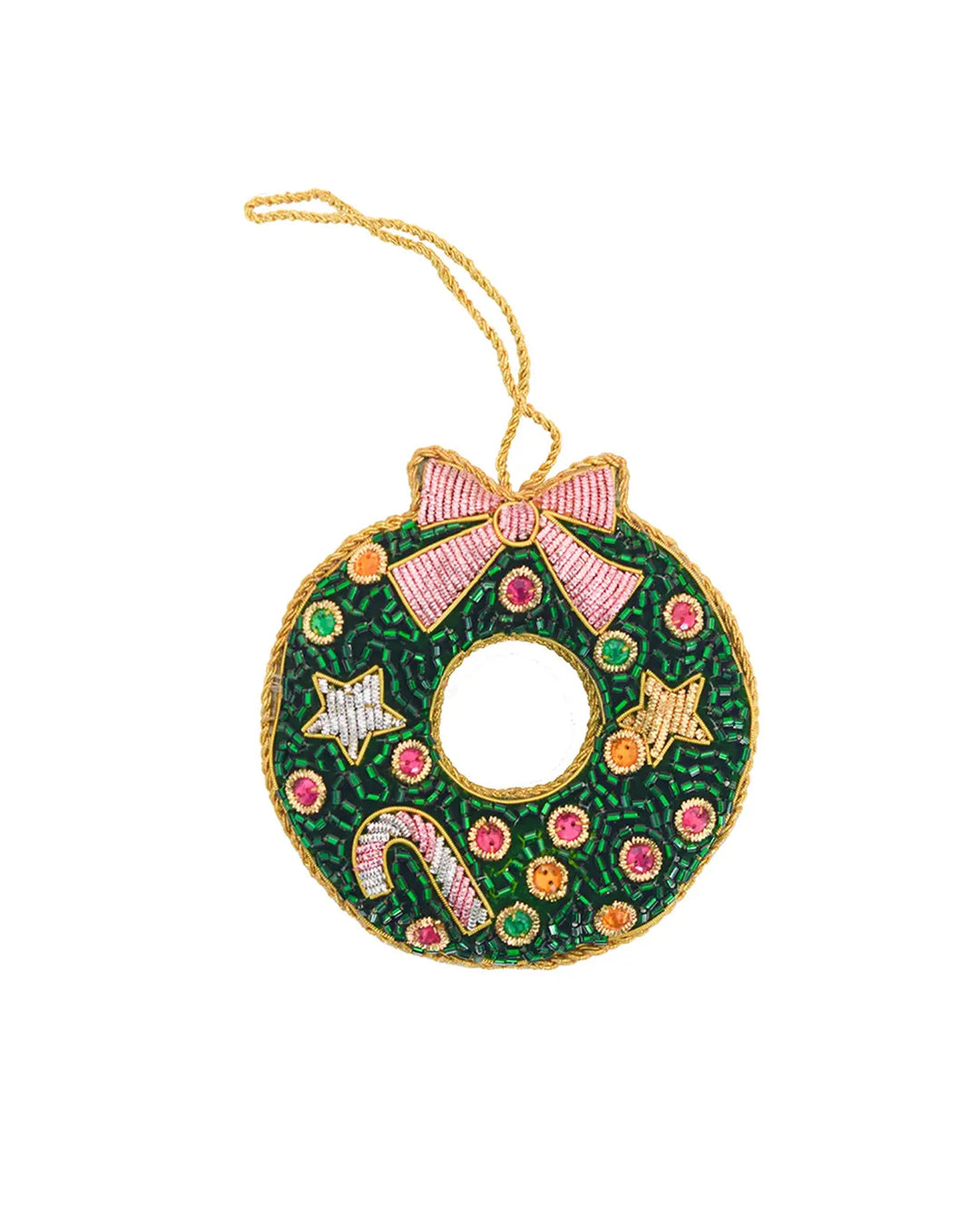 · Adorned with glittering details and metallic fabric.· Dimensions: 3.6" x 3.4" · Handmade in India