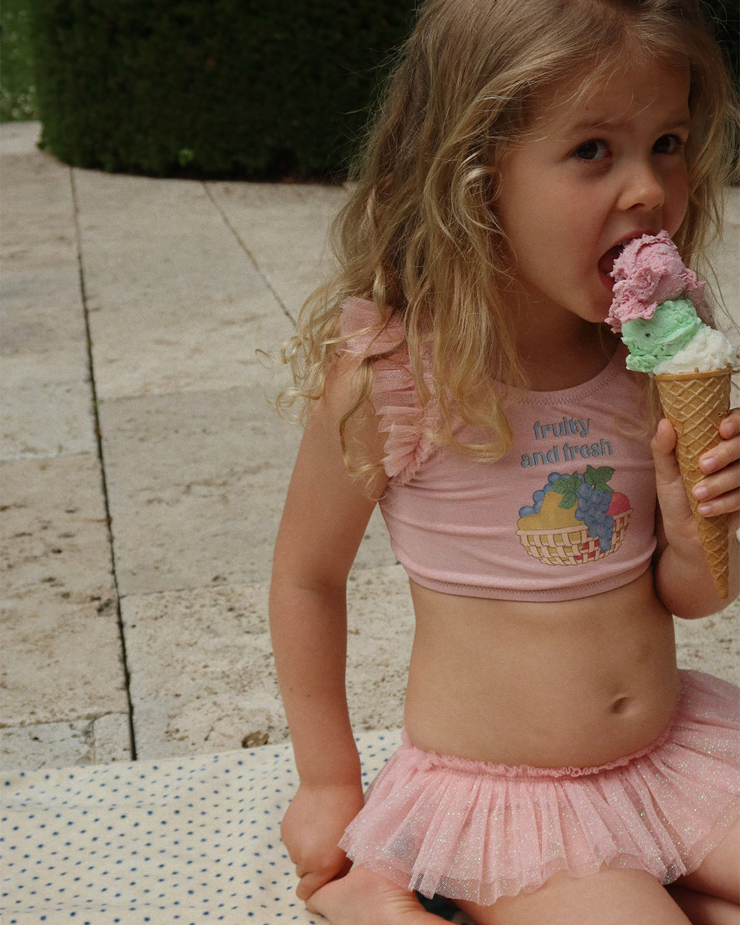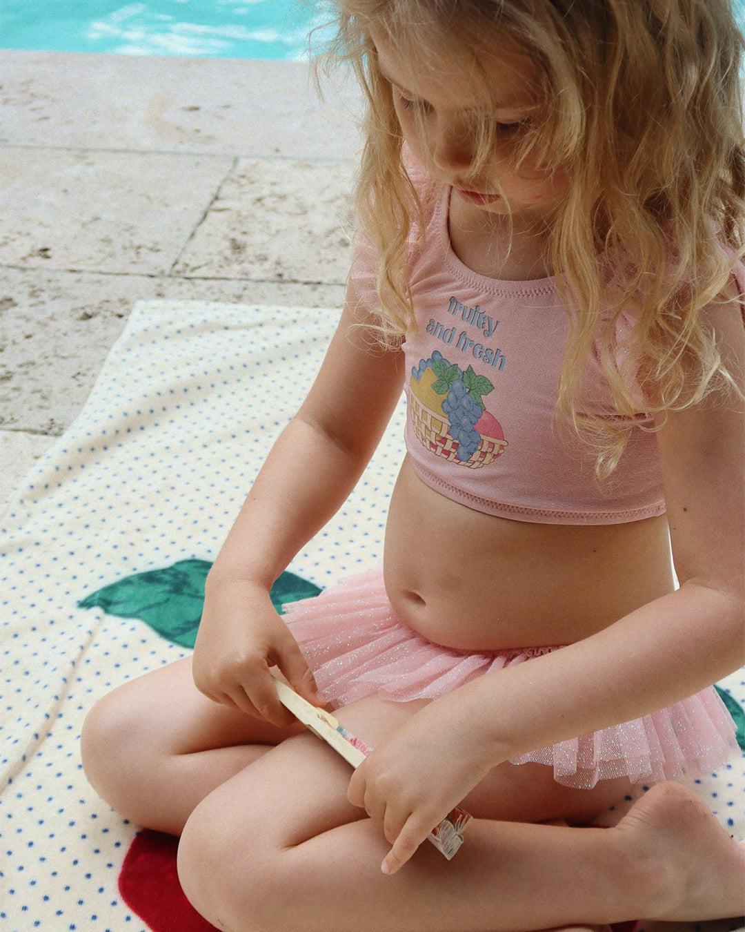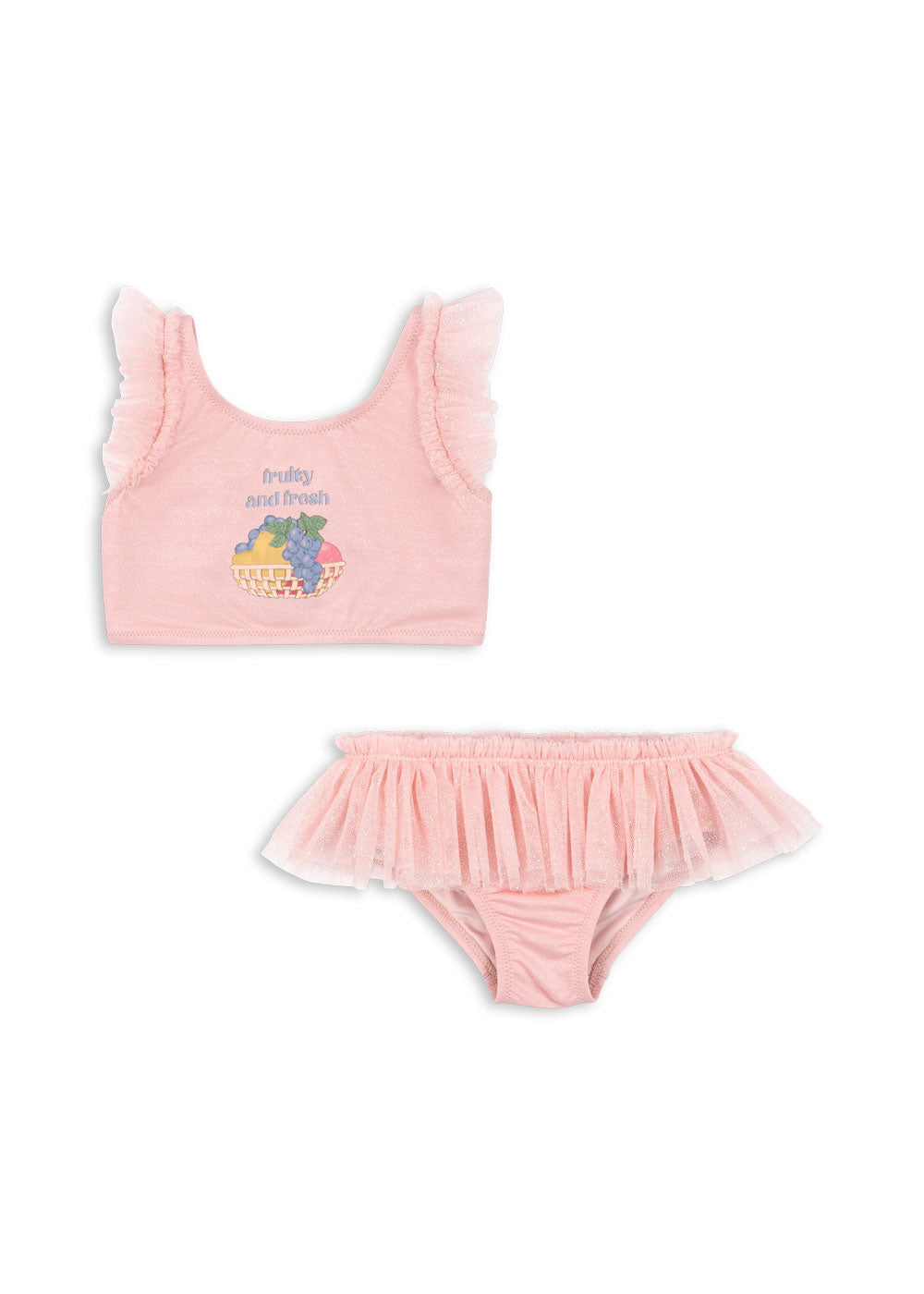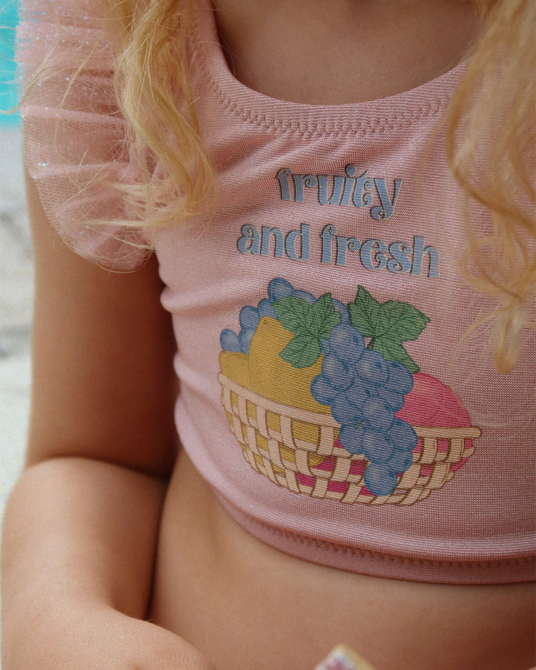 · Blush pink two-piece swim set with “Fruity and fresh” fruit graphic
