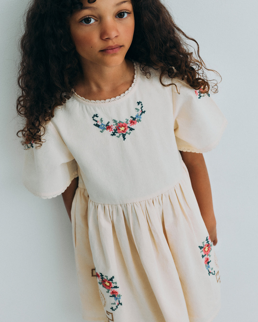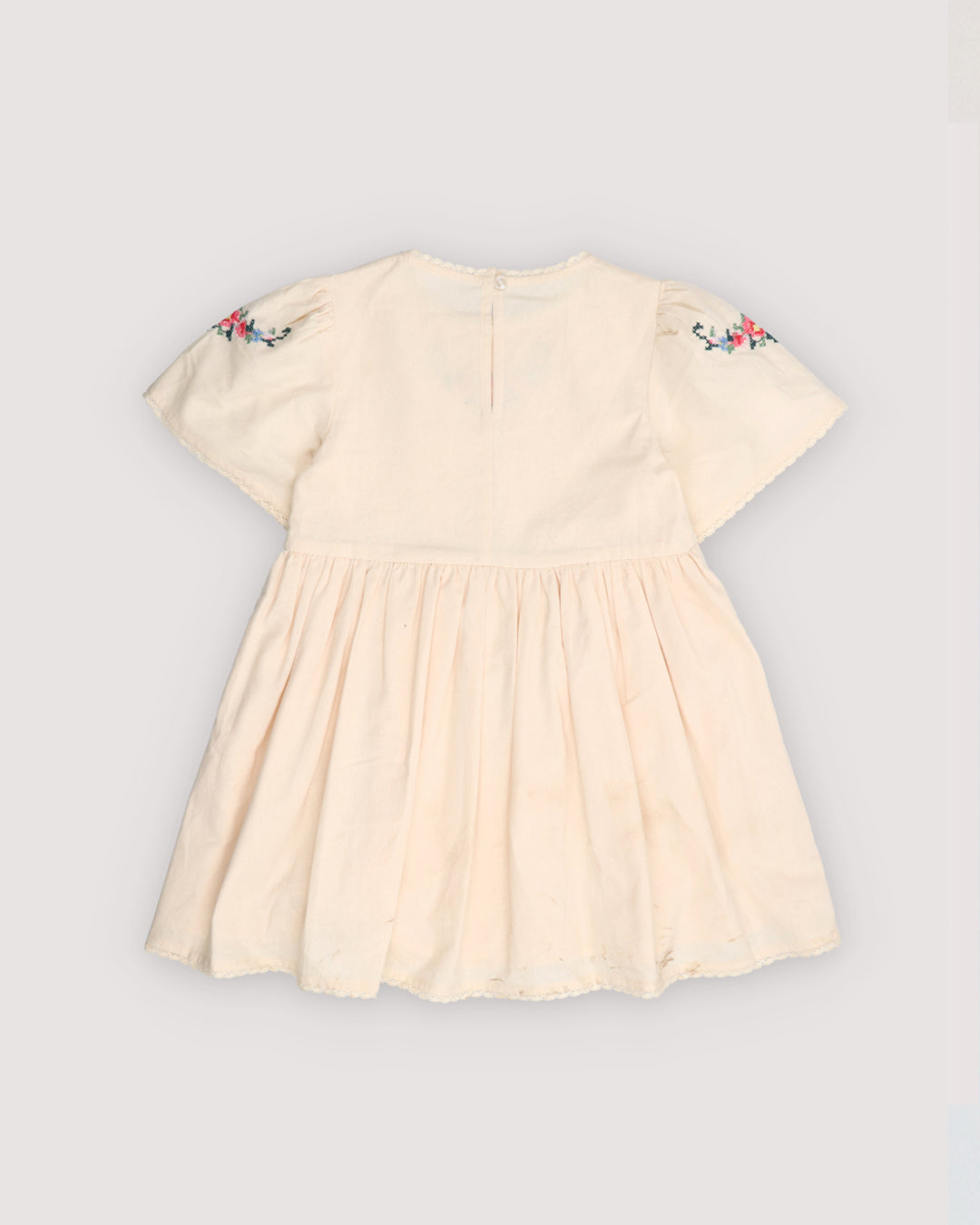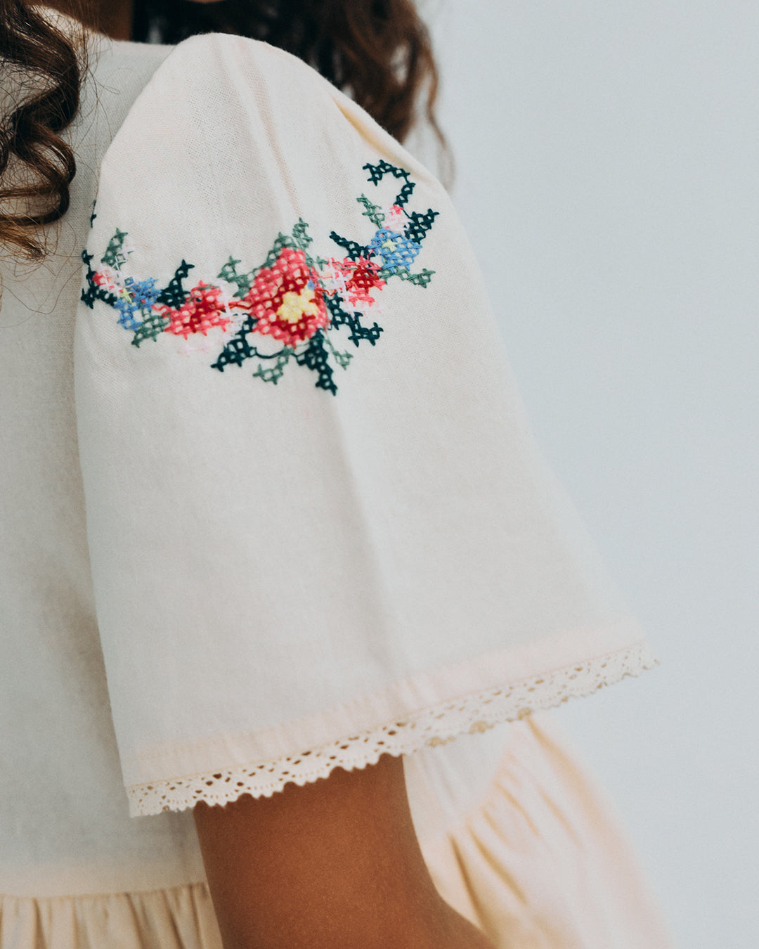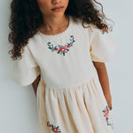 · Soft ecru dress with delicate cross-stitch floral embroidery
