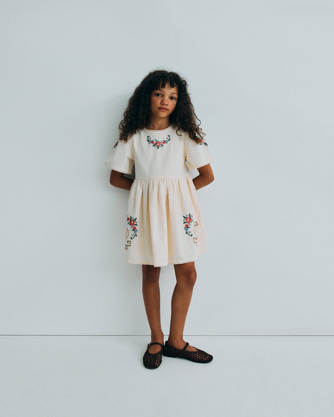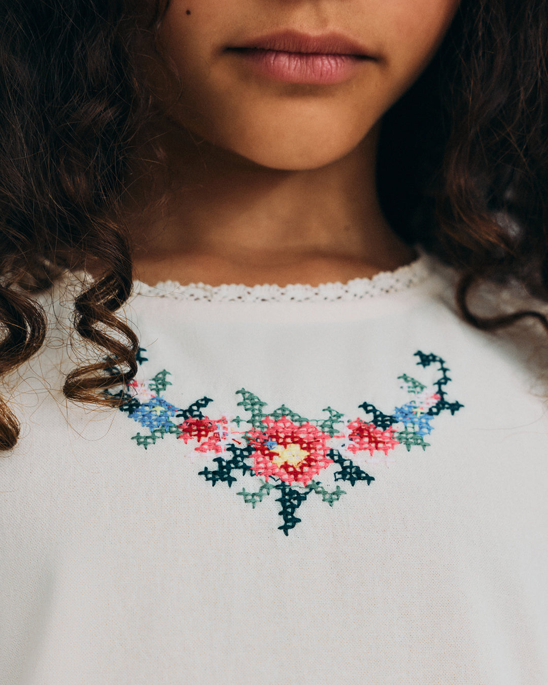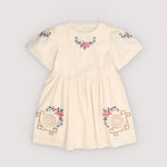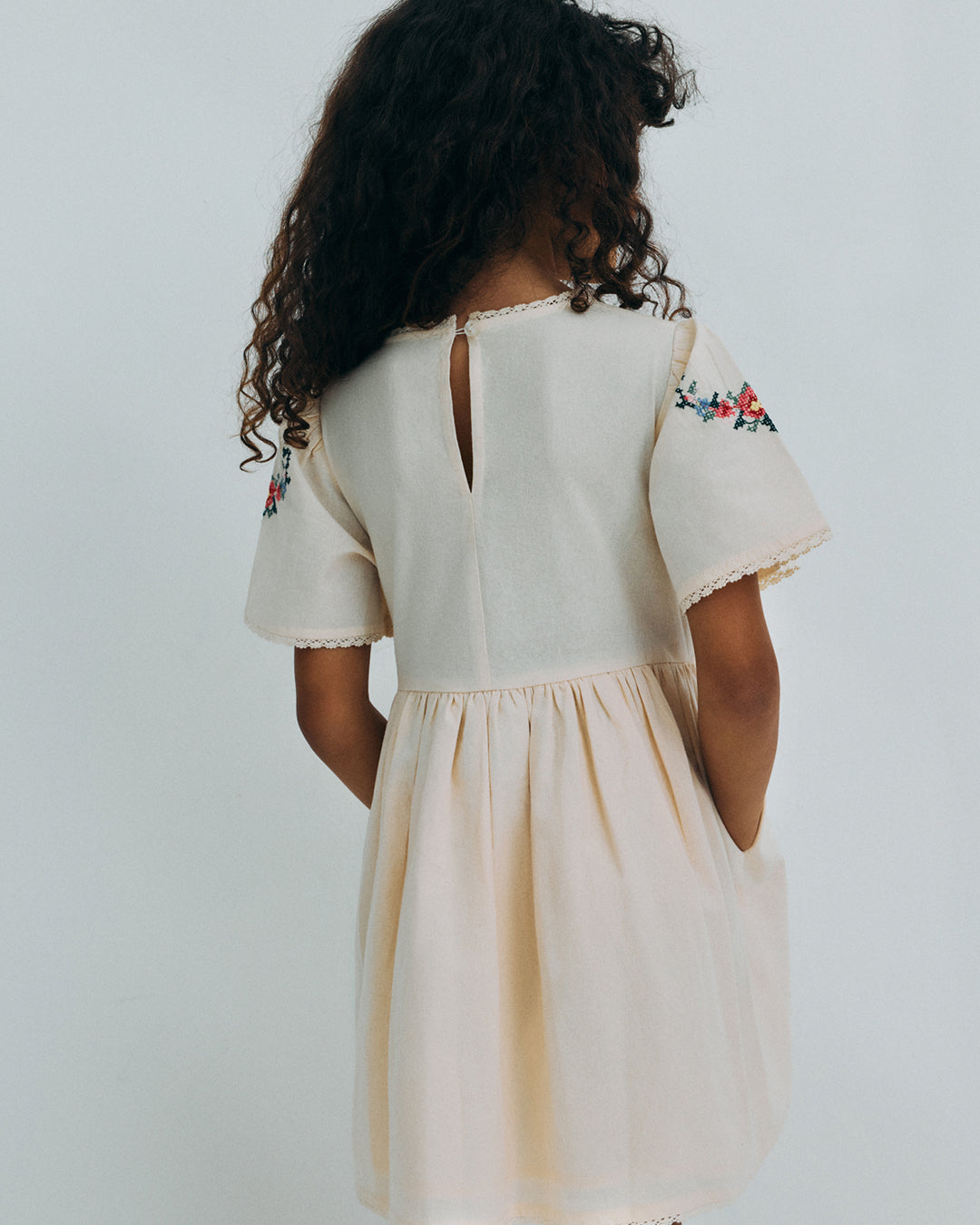 · Soft ecru dress with delicate cross-stitch floral embroidery