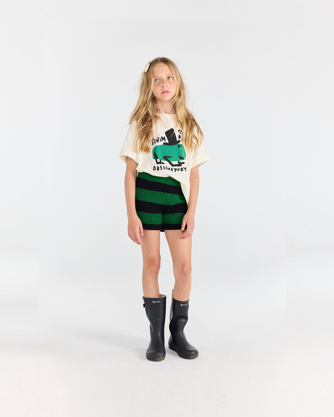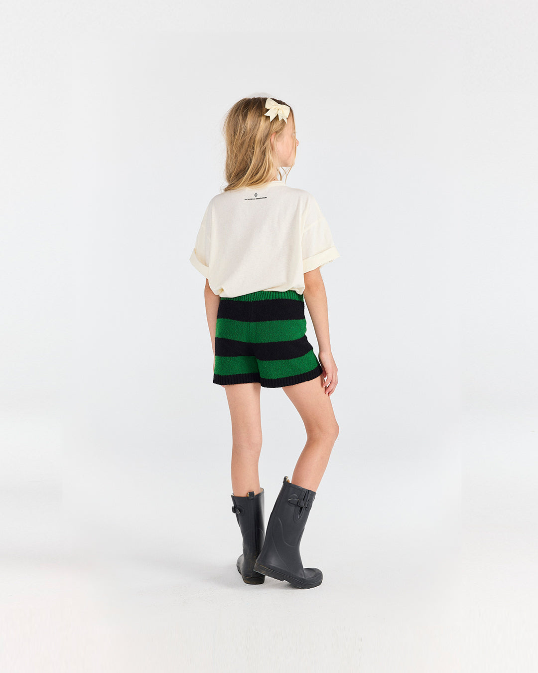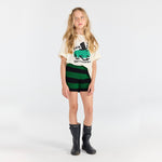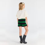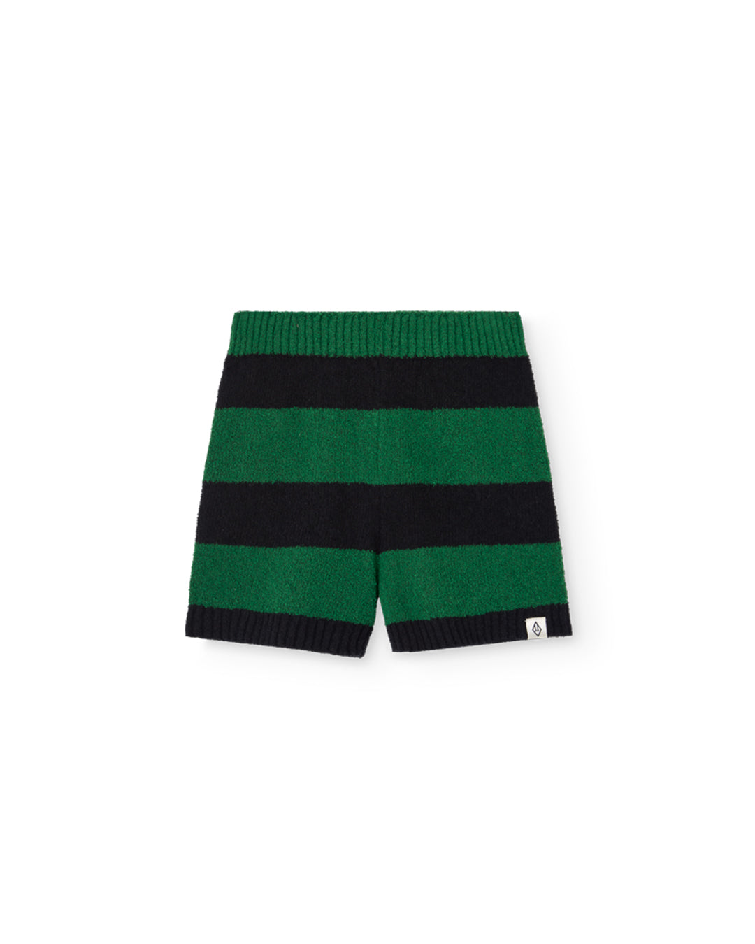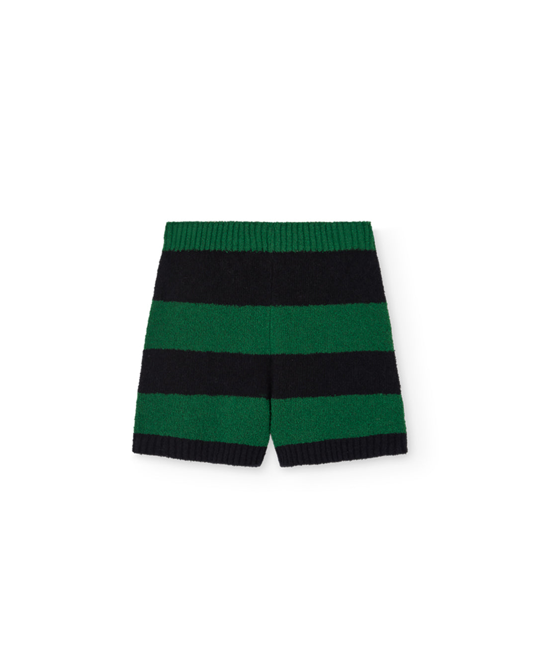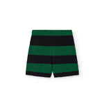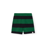 · Soft terry shorts with bold green and black horizontal stripes