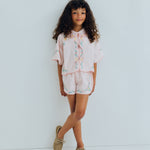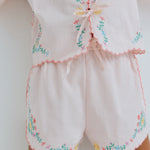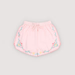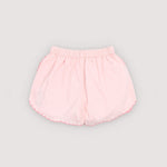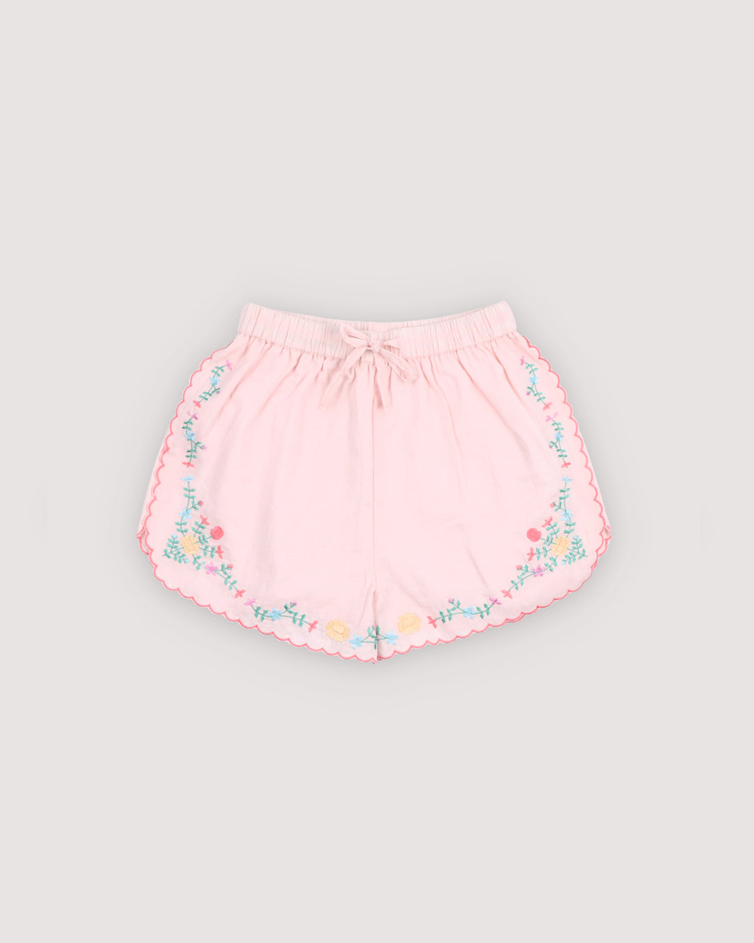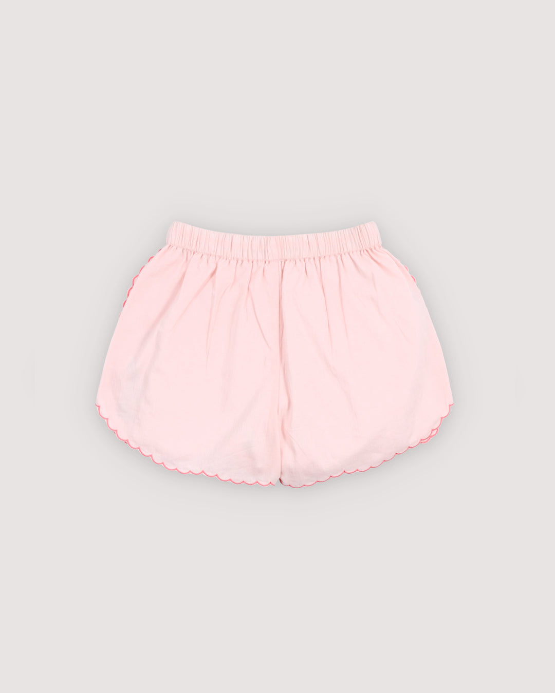 · Sweet petal-pink shorts with scalloped embroidered edges