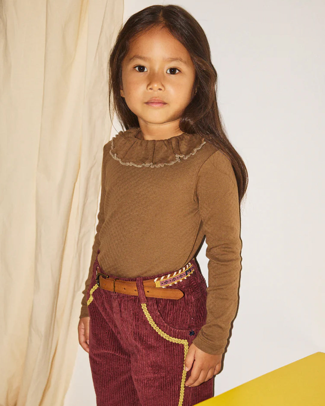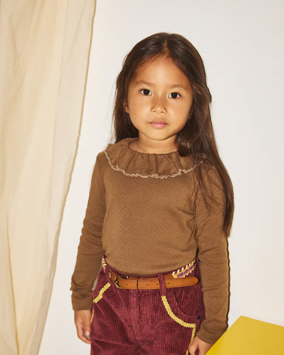 · Features a delicate ruffled collar with contrast trim