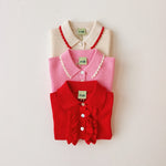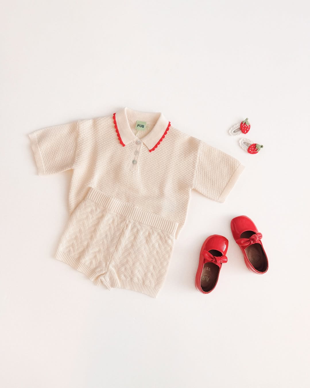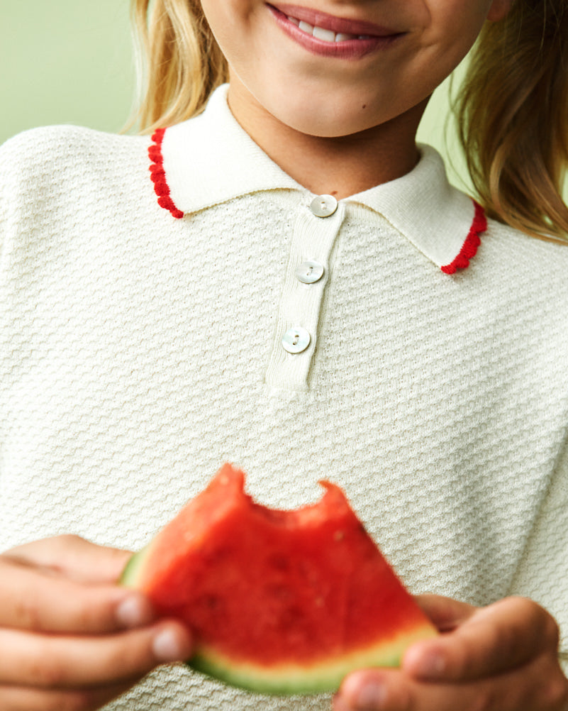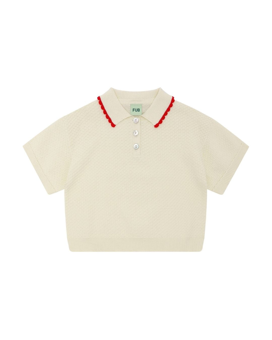 · Classic polo collar with red scalloped trim
