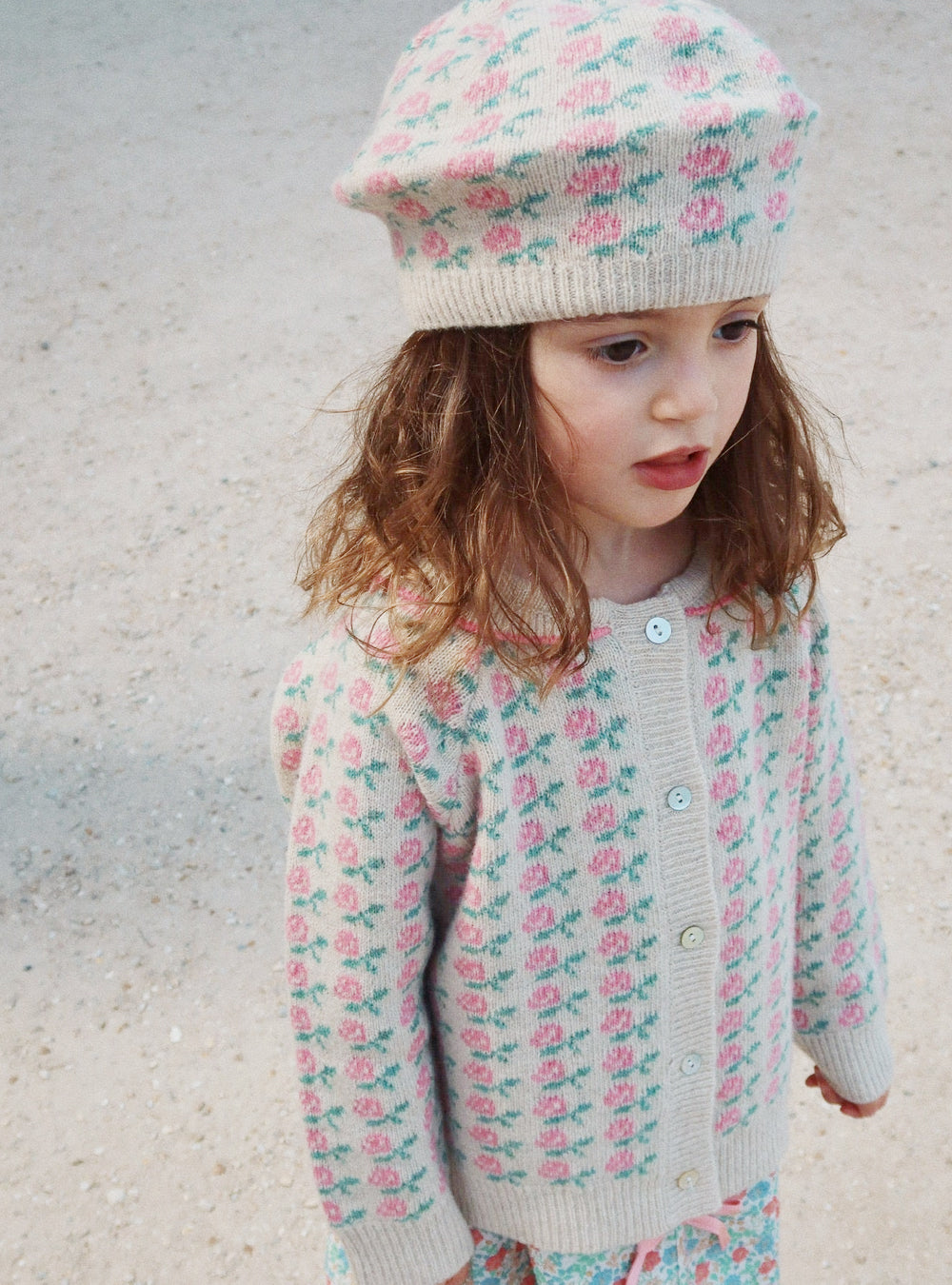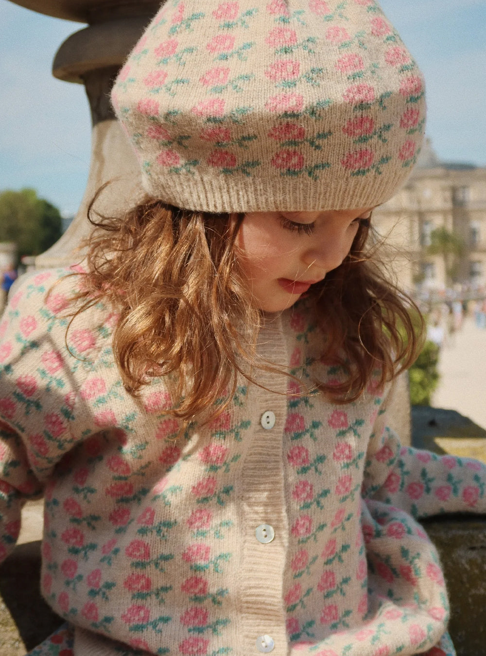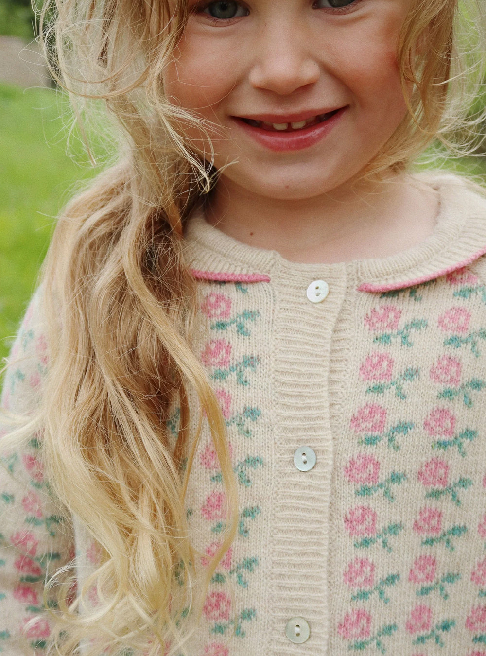 · A soft wool cardigan with an all-over rose jacquard pattern