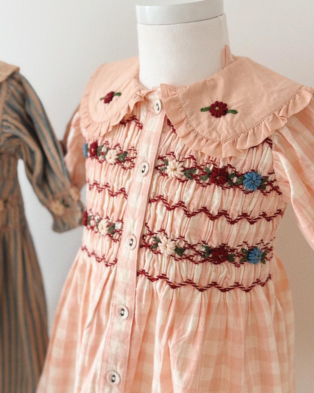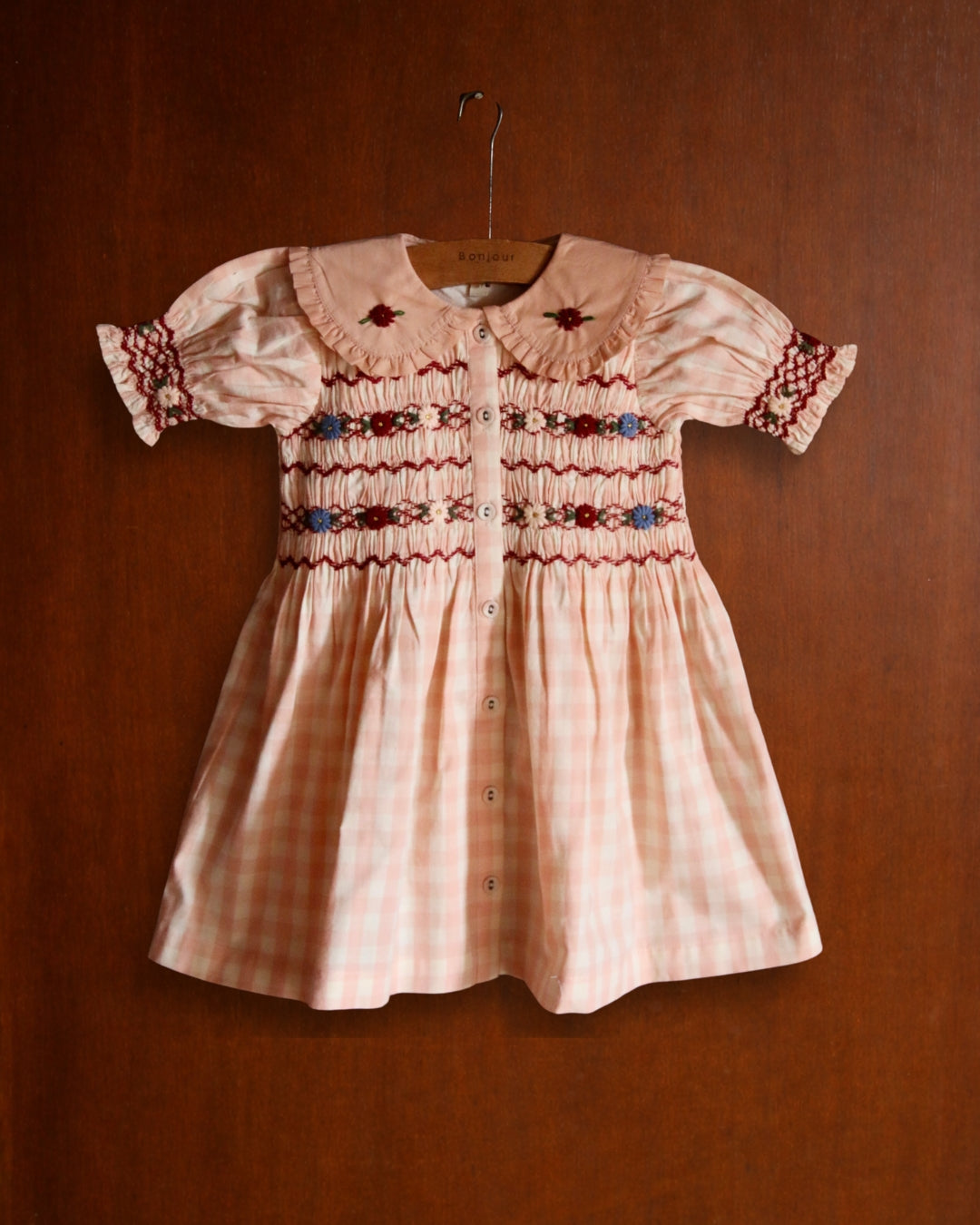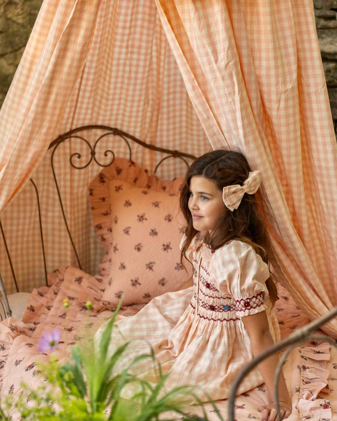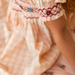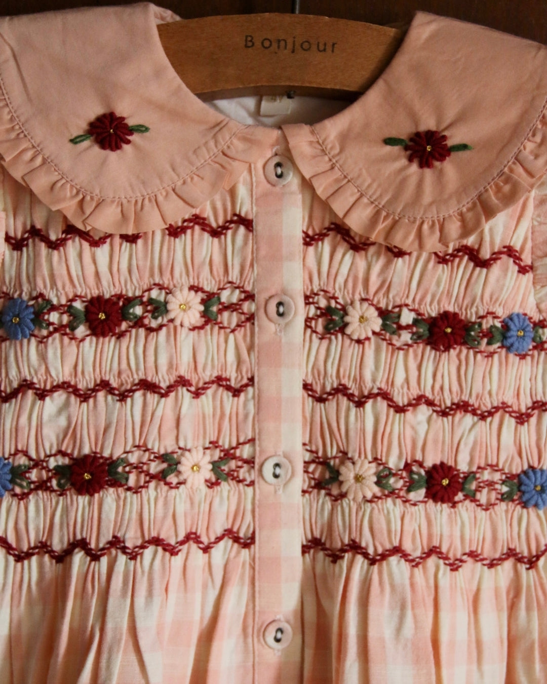 · A romantic pink vichy tunique featuring delicate hand-smocking across the bodice