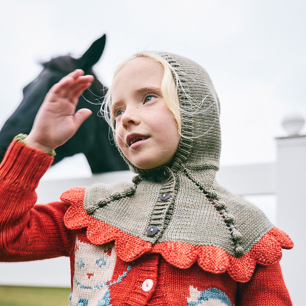 · A hand-knit capelet in heavier-weight Merino wool, with a bonnet-style hood and a small ruffle capelet that drapes down over the shoulders, contrast scalloped edge trim, eyelet and popcorn stitch detail, and horn button closure up the front.
