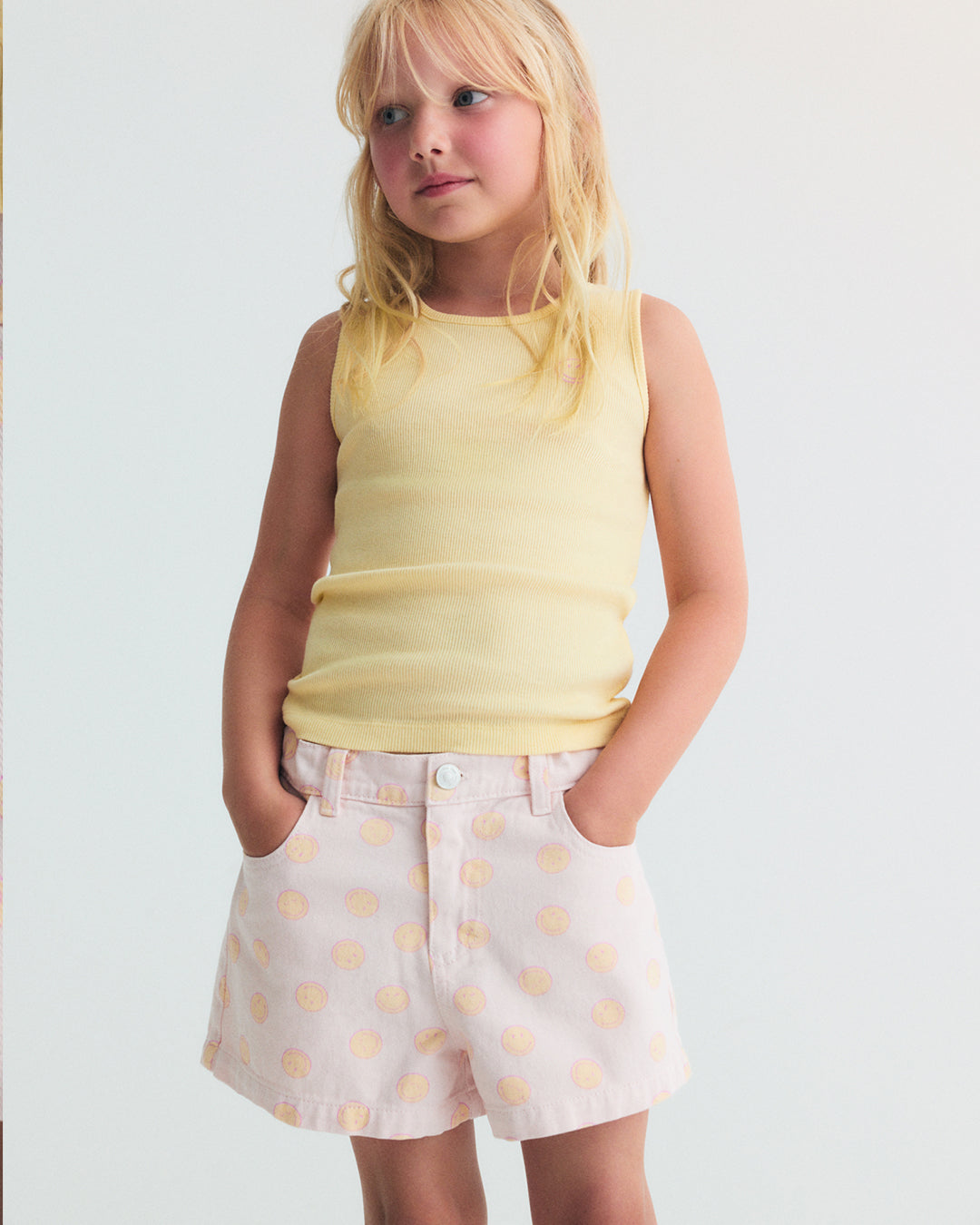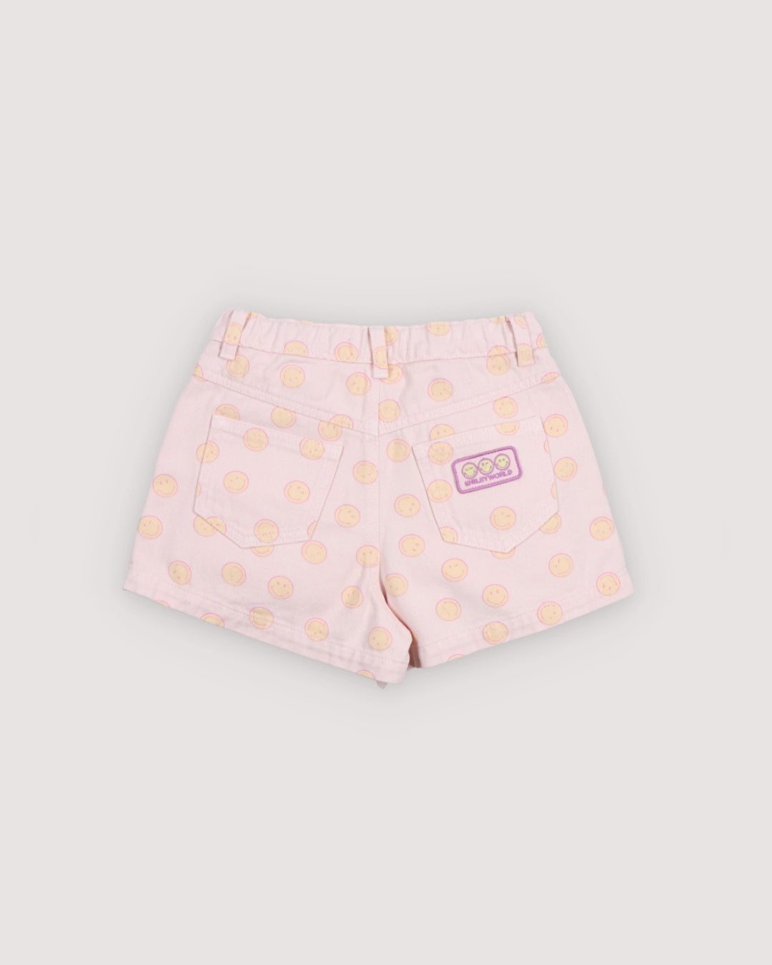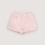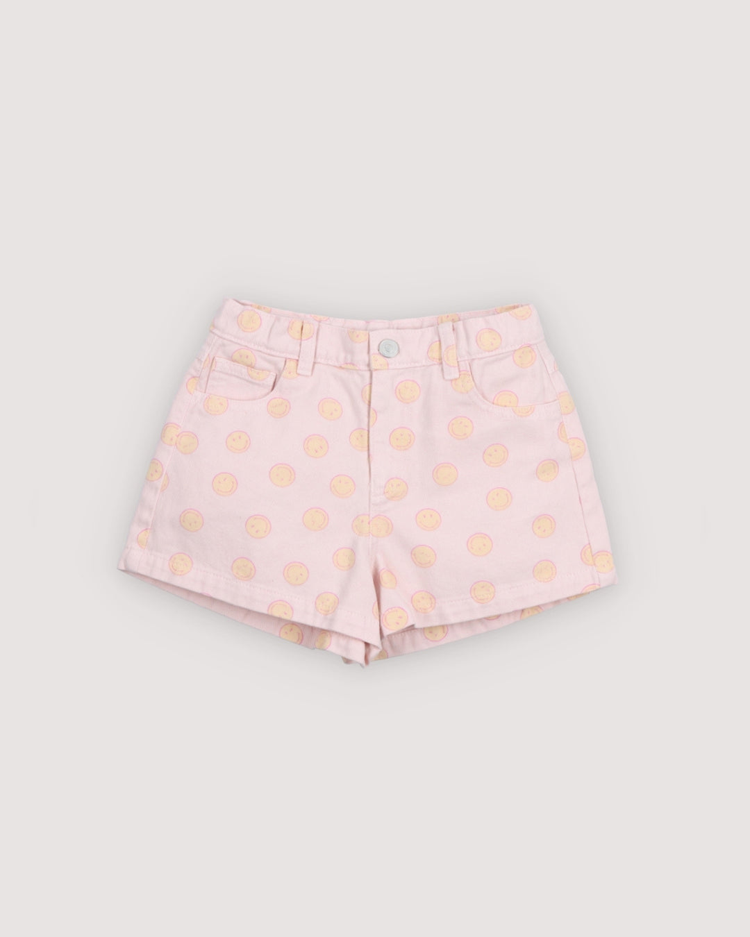 · Light pink denim shorts with all-over smiley print
