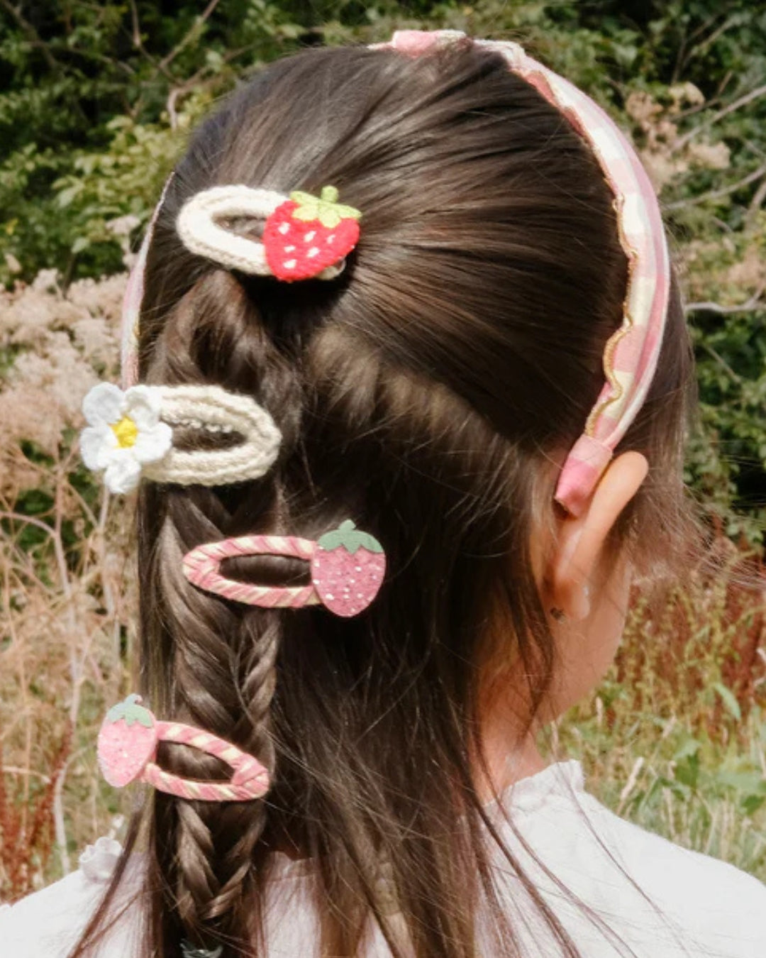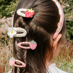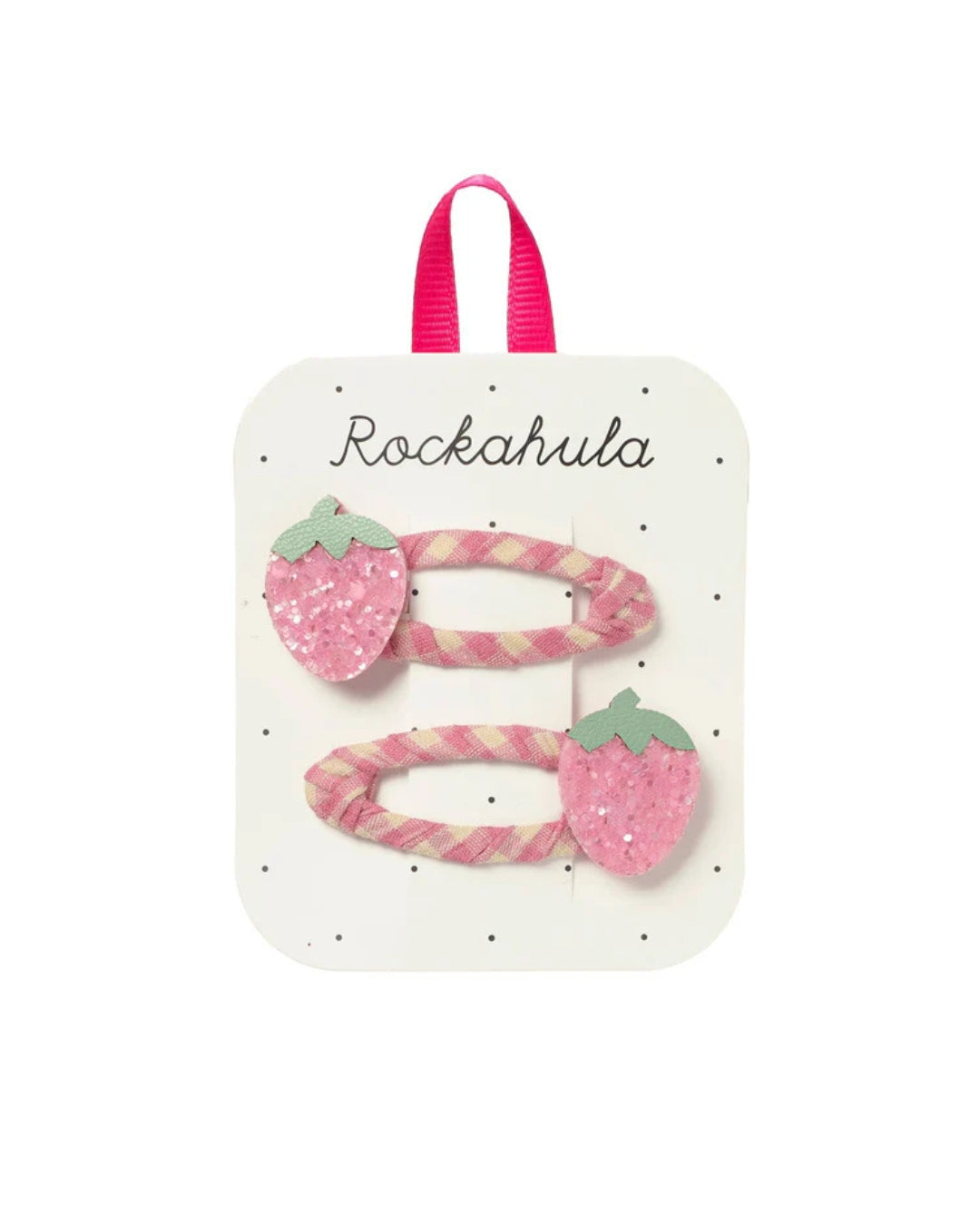 · A cute set of two strawberry snap clips with playful detailing