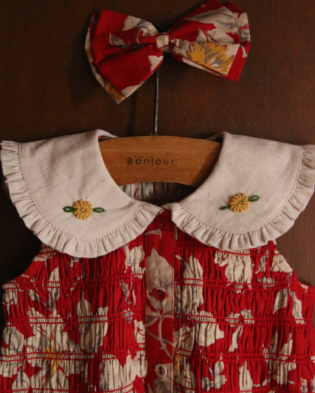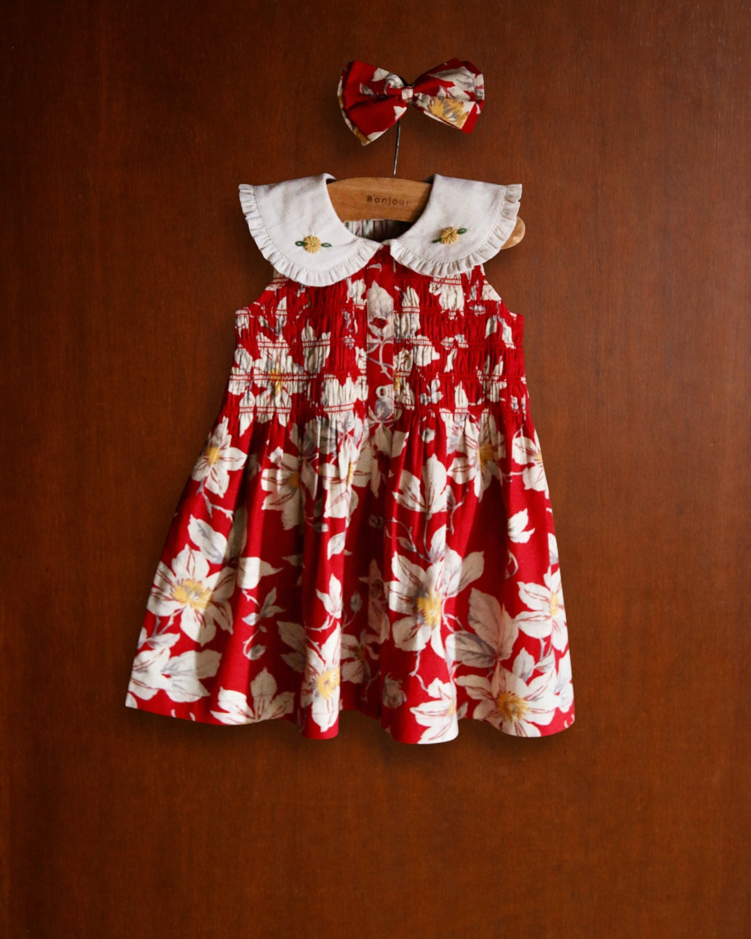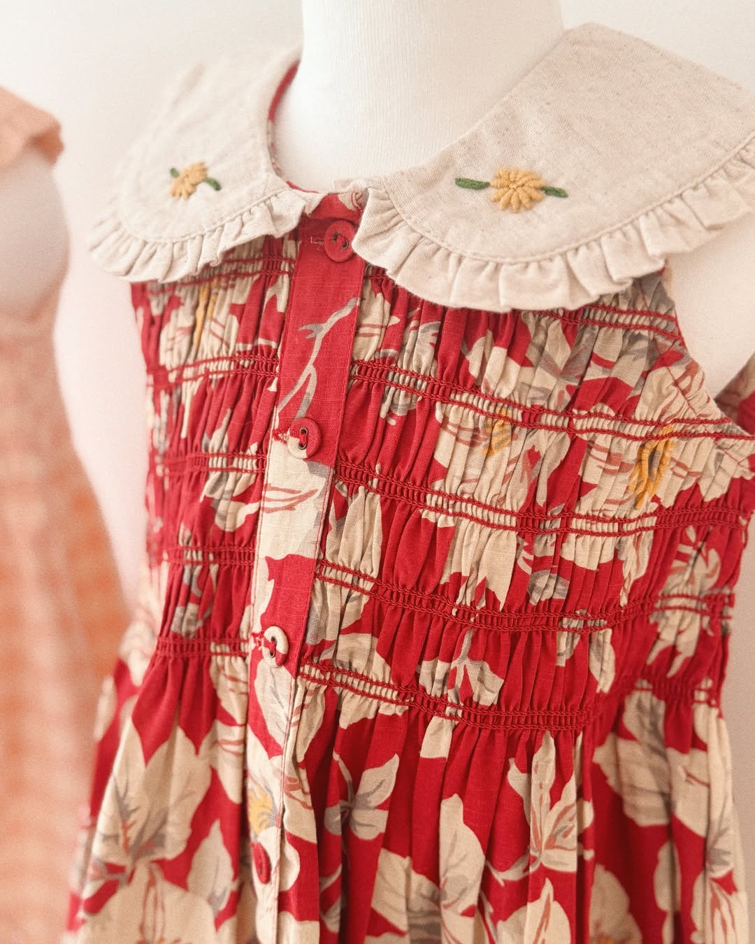 · A vibrant red floral tunic featuring delicate hand-smocking across the bodice