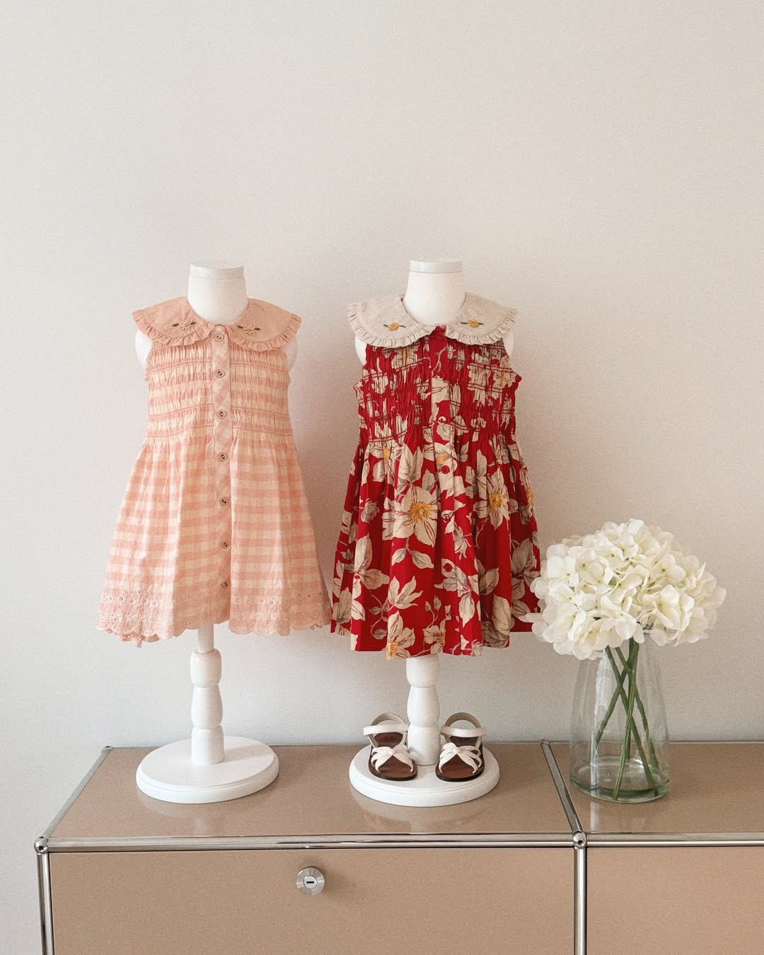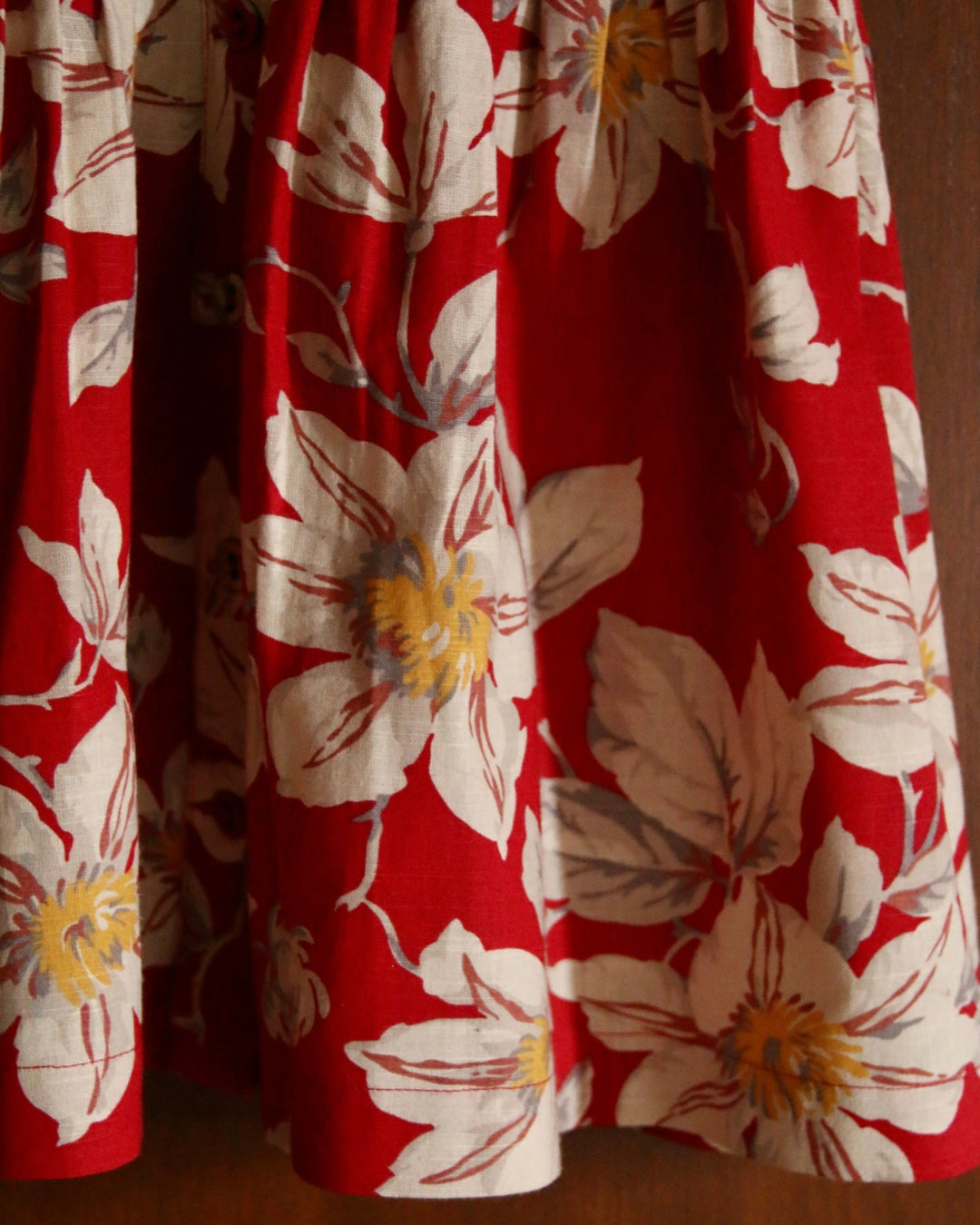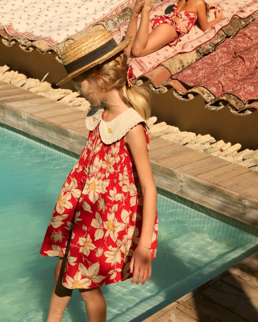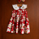 · A vibrant red floral tunic featuring delicate hand-smocking across the bodice